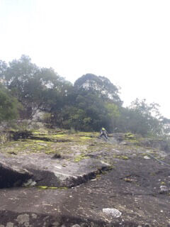 ここは最初にリーダーが取り付いたものの、いきなりハングし岩肌が湿っていた為、ボルトにかけたアルヌンを手掛かりに人工登攀で突破、その後は危なげなく登りきりビレイ解除の合図、その後谷口さんがやはり最初の取り付きで苦労しながらも突破。