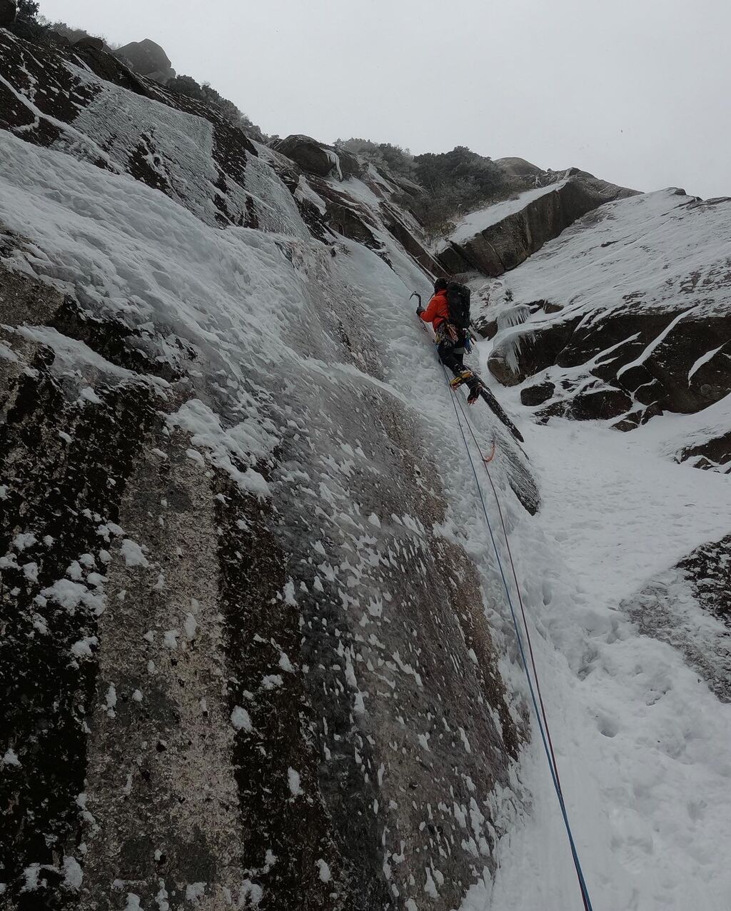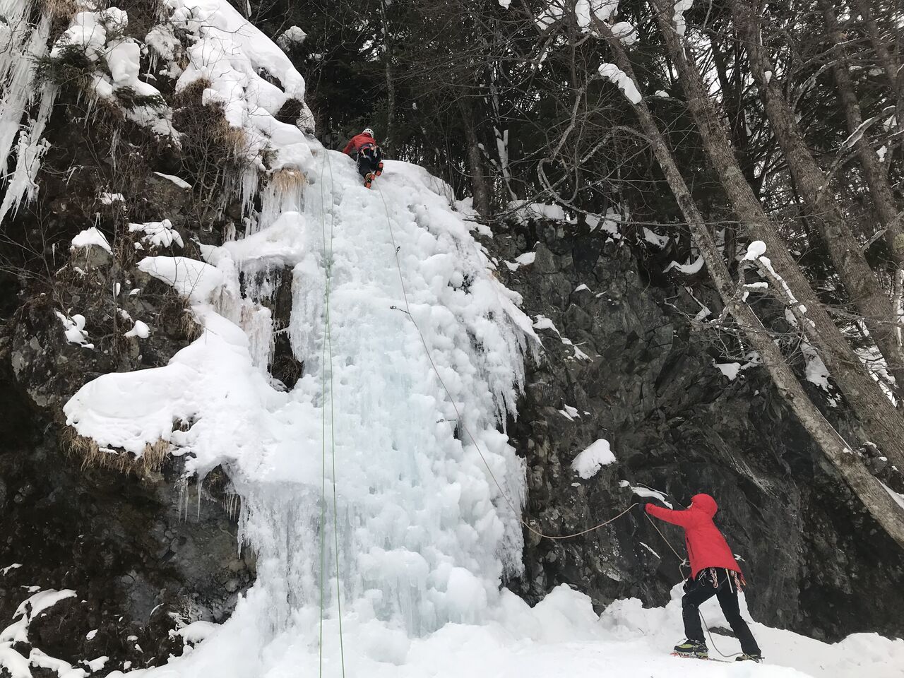 ロープ残り10mのコールを聞いてから氷の厚そうなところまで行って終了。アックスとスクリューでセルフビレイをとってアバラコフ作り開始。