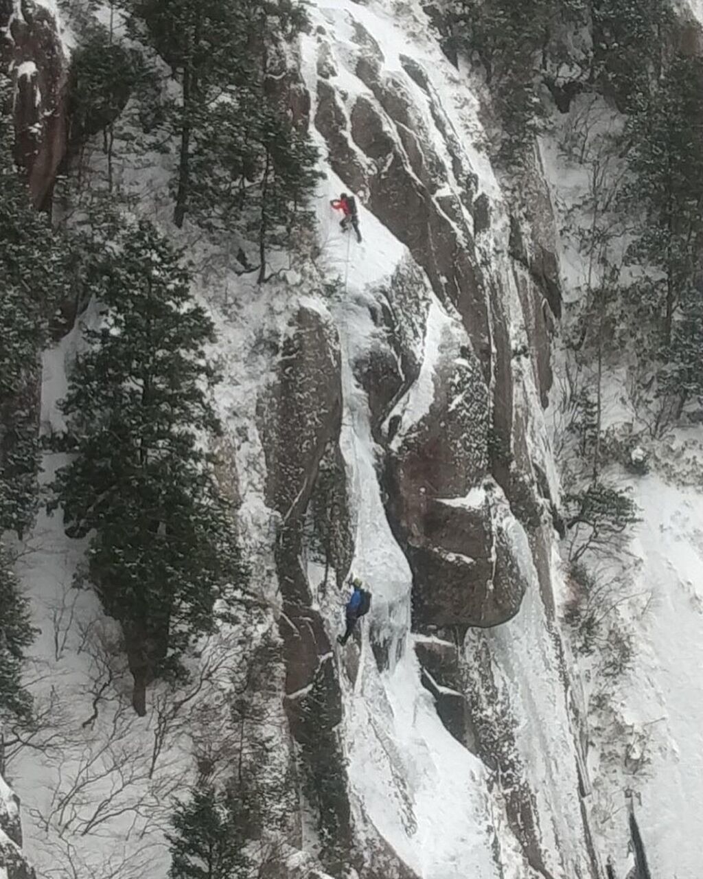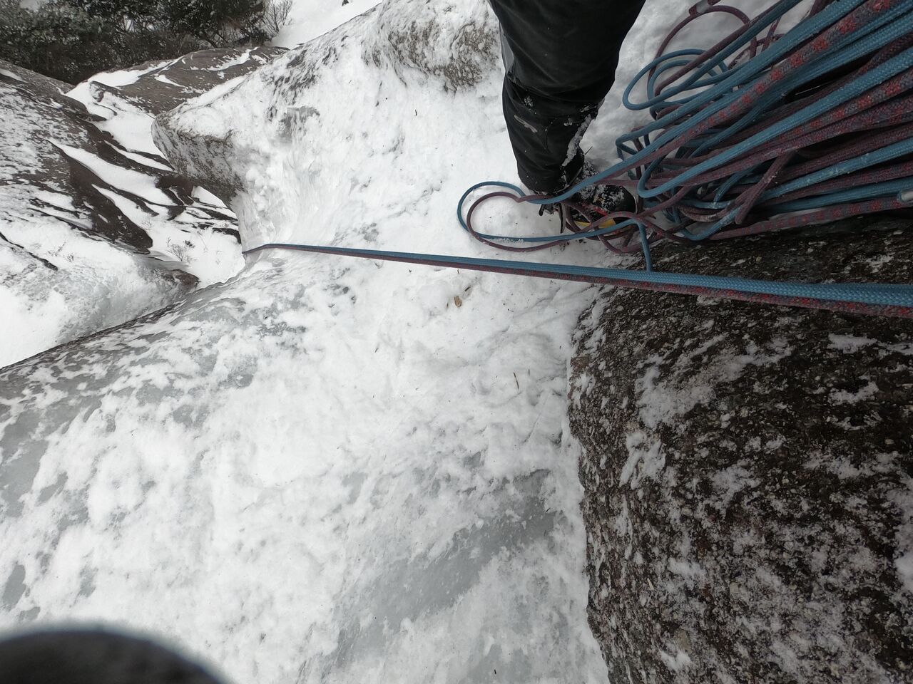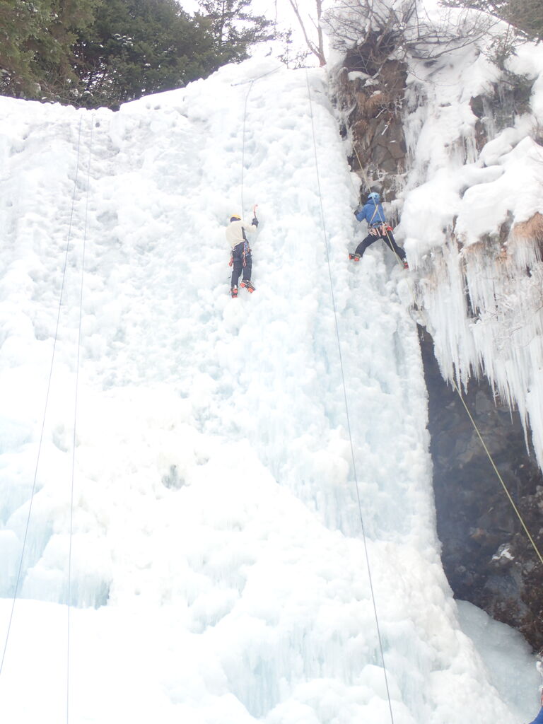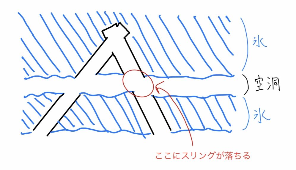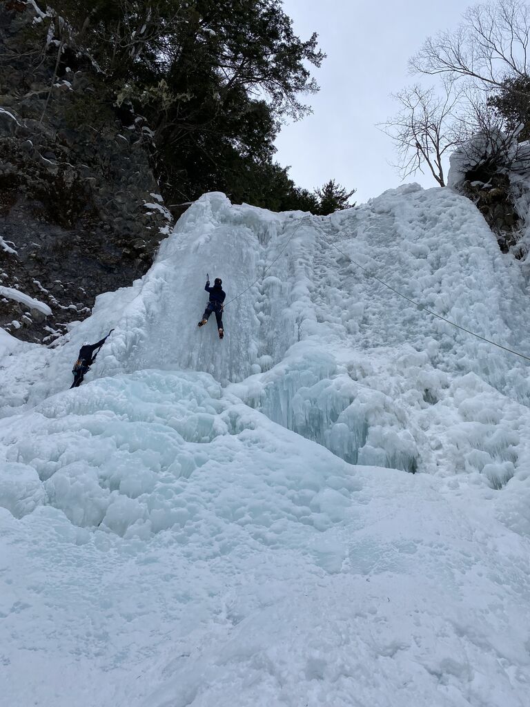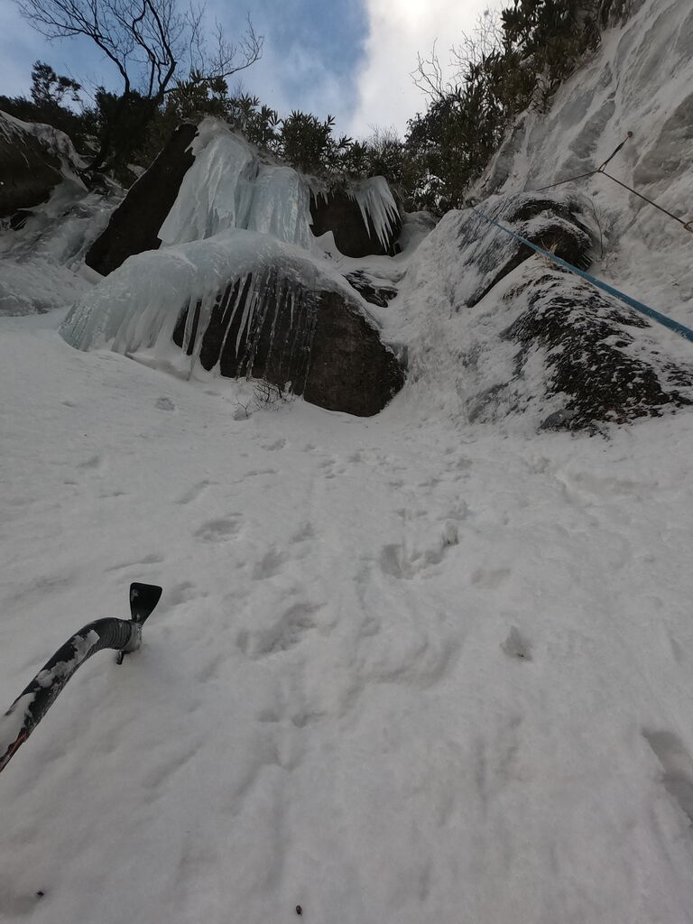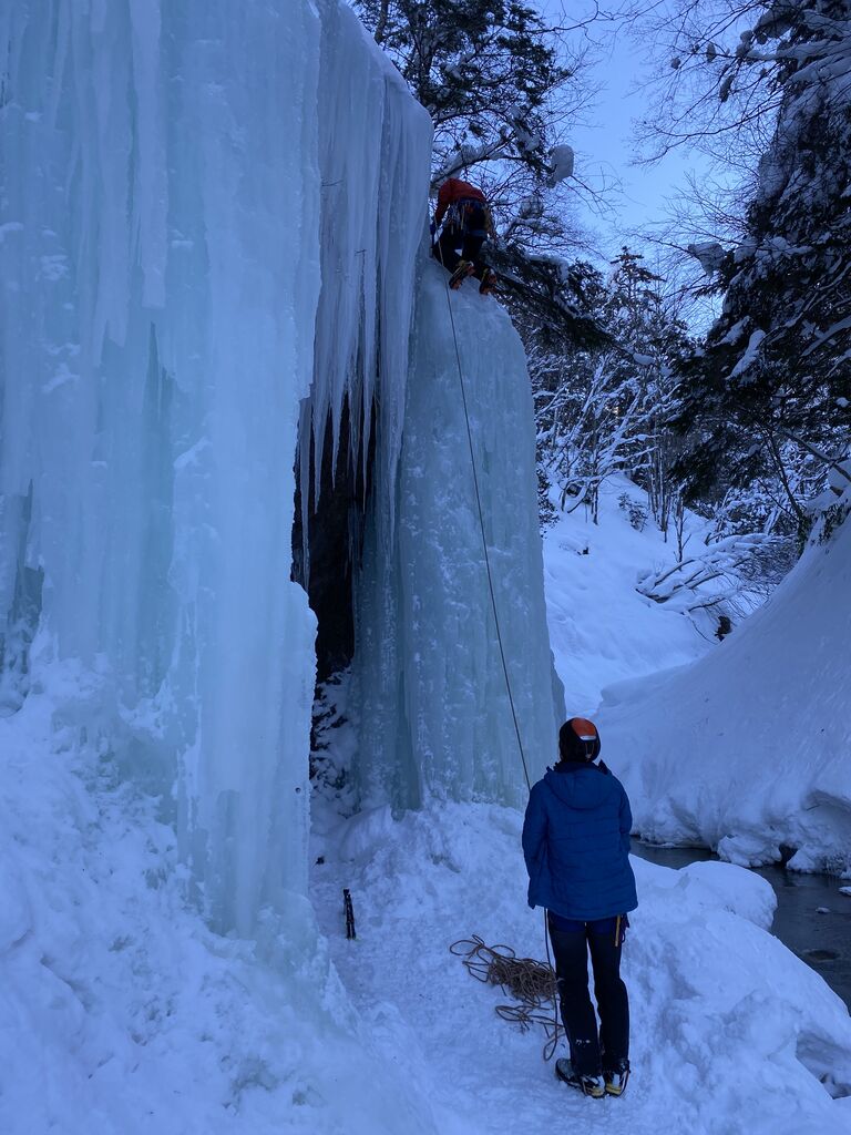 次は無事に穴が空いて、うまく貫通した。直接ロープを通して残置無しでやってみようとするも、フックがなかなか引っかからず、挙げ句の果てにどうやら氷が2層になっていたようで、穴にロープが通らなくなってしまった。氷が2層になってたことには全く気づいて無かったので結果的に気づけて良かった。