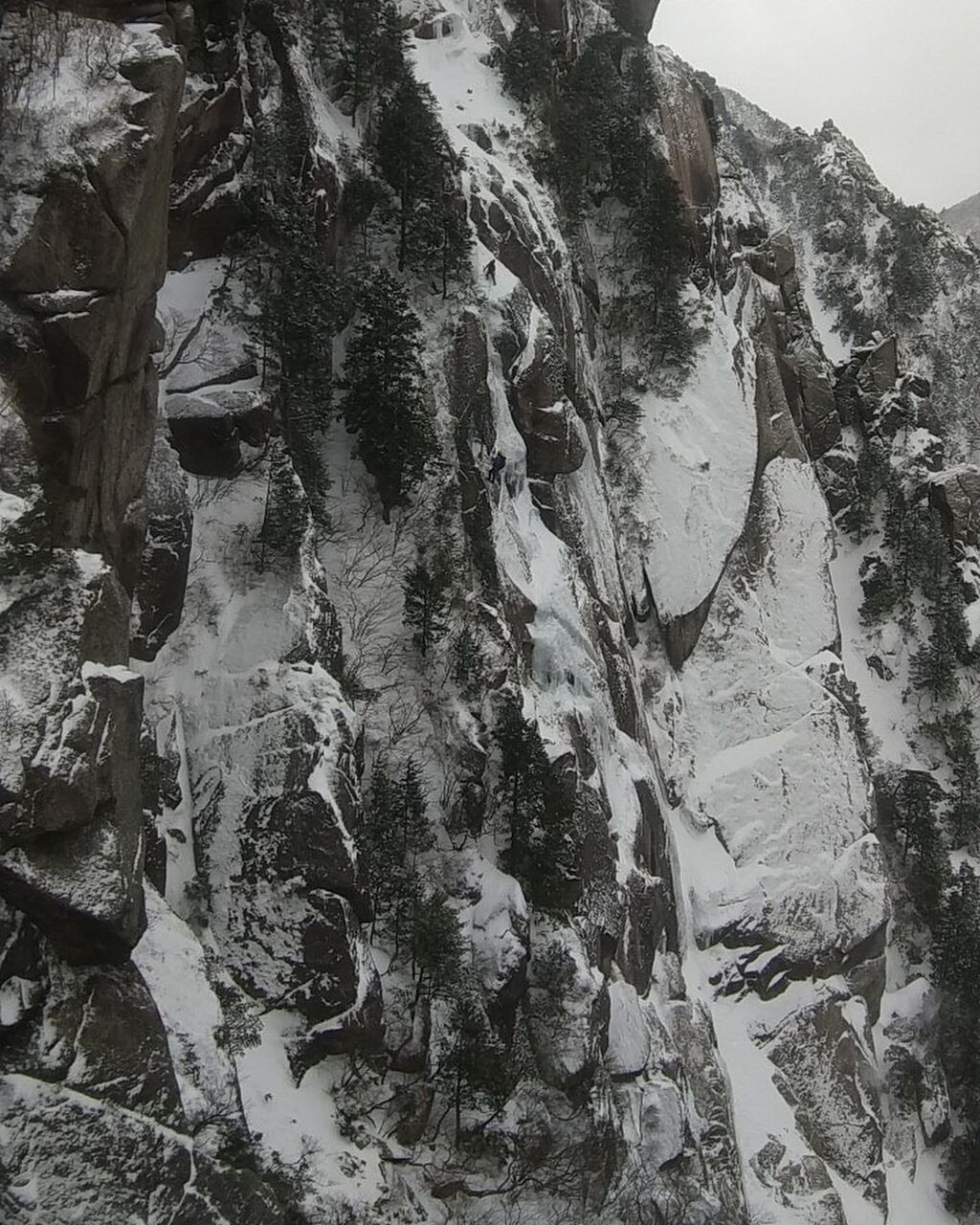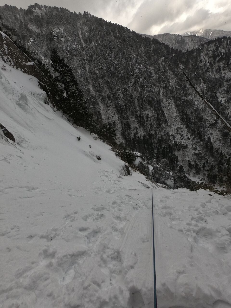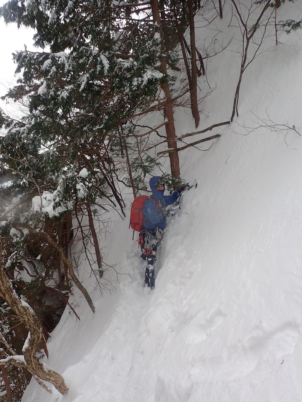 下部バーチカルを抜けると落ち口からは雪でゴソゴソ、アックスが効かない!