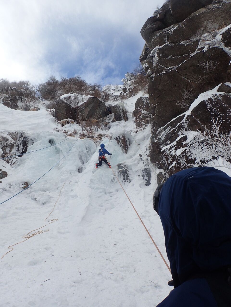 もっと氷の分厚いところに場所を変えるために、一回ビレイし直してもらい、クライムダウンして再度セルフをとり、再び作業開始。