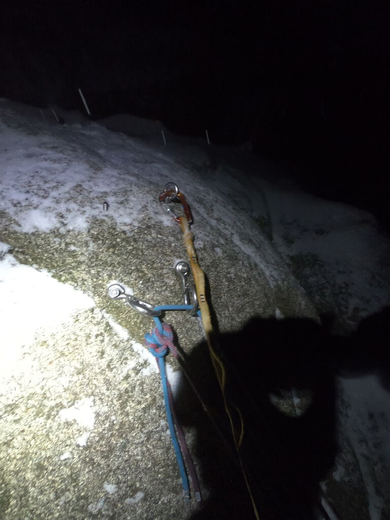 微妙にスクリューの向きがずれてしまってなかなか貫通せず、スクリューとグリベルのカンデラで片側の穴を削って穴を広げることでどうにかスリングを通すことができた。