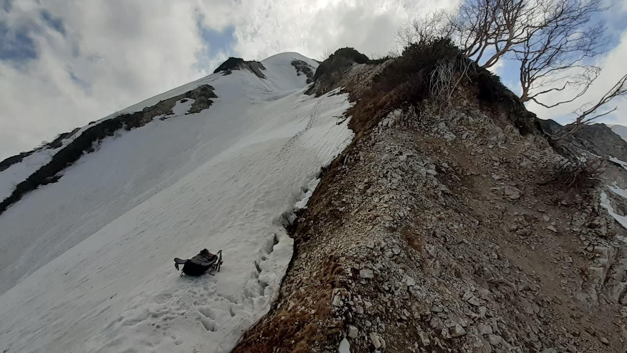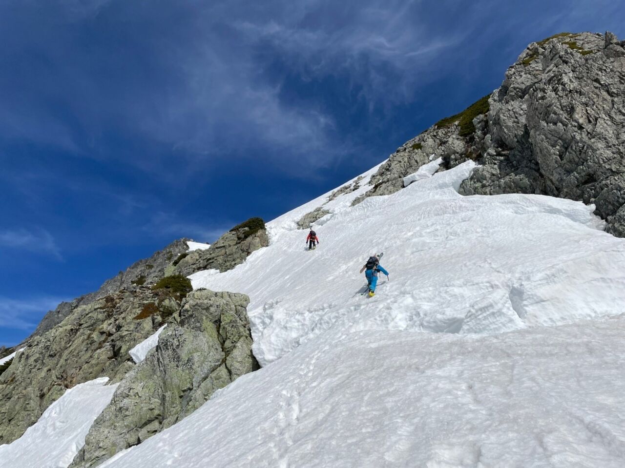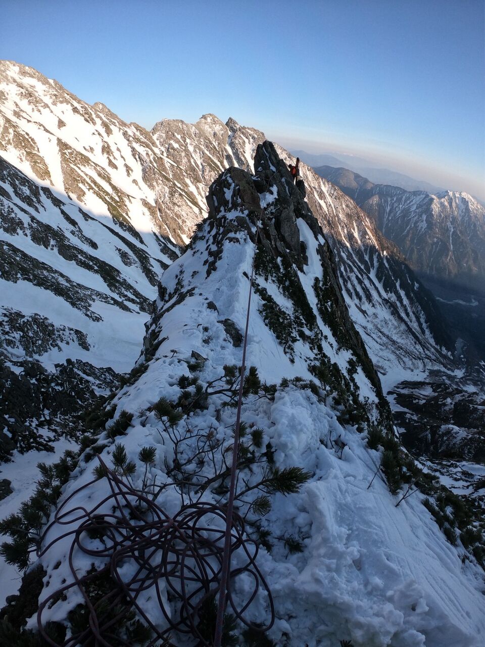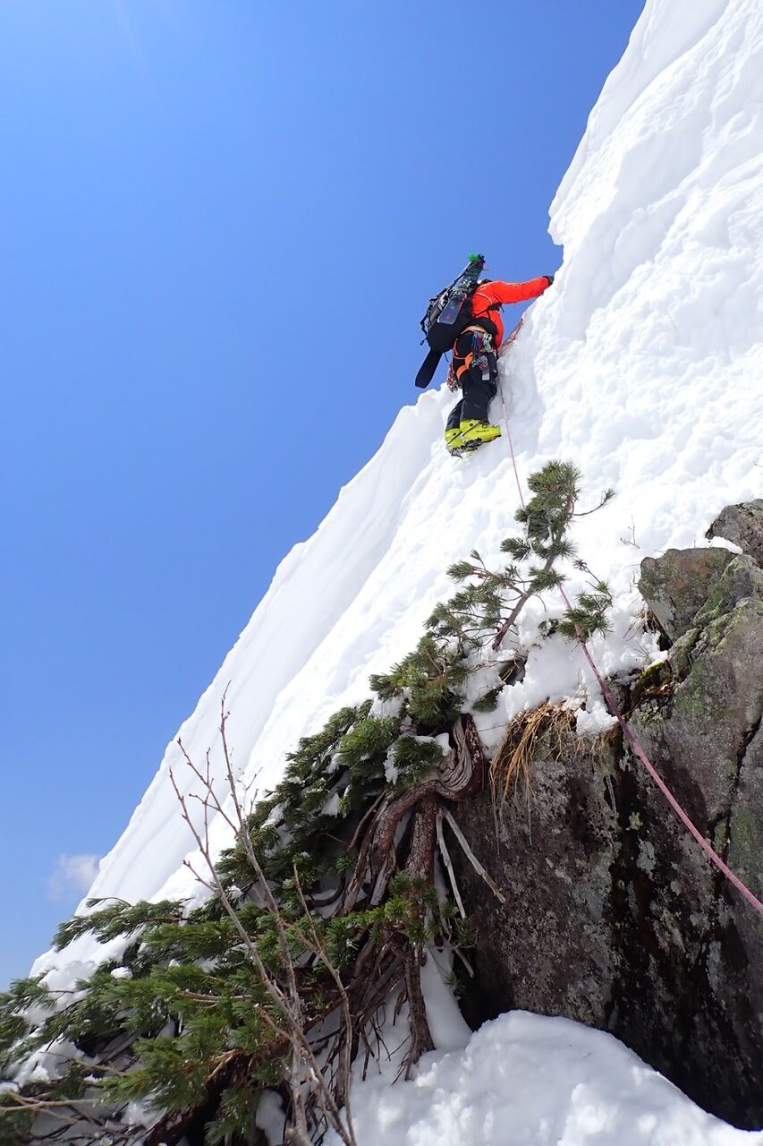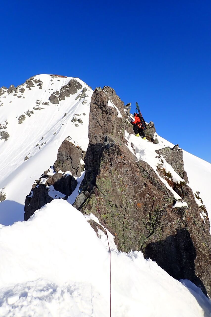 今回、稜線上もロープを出すようなところはなかったが、もっと雪が多ければロープを出したりしたかもしれないし、雪稜で確保点が思うように取れなかったりもすると思うので、ほんと条件次第なのだろう。