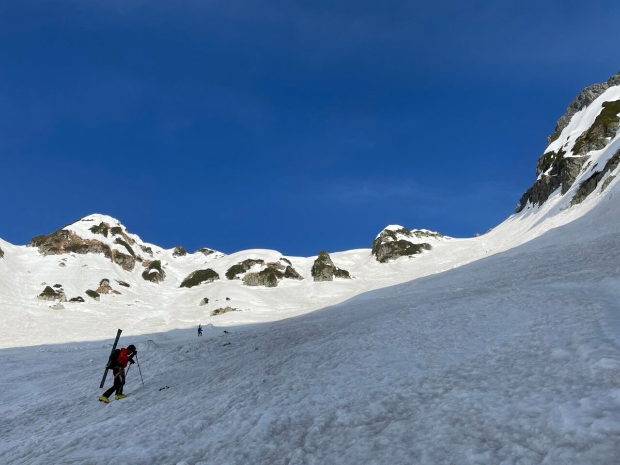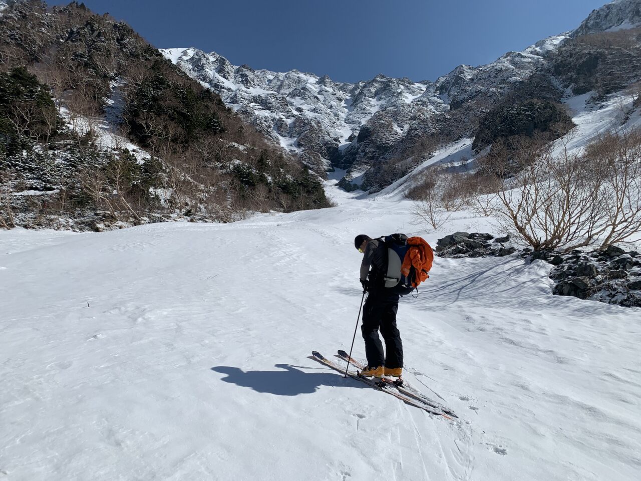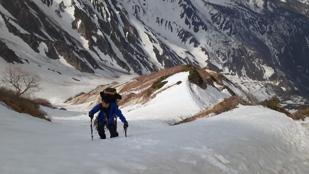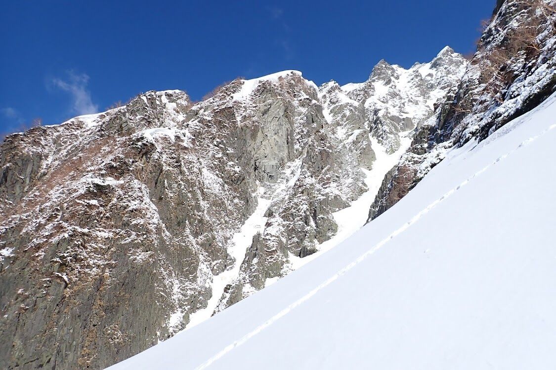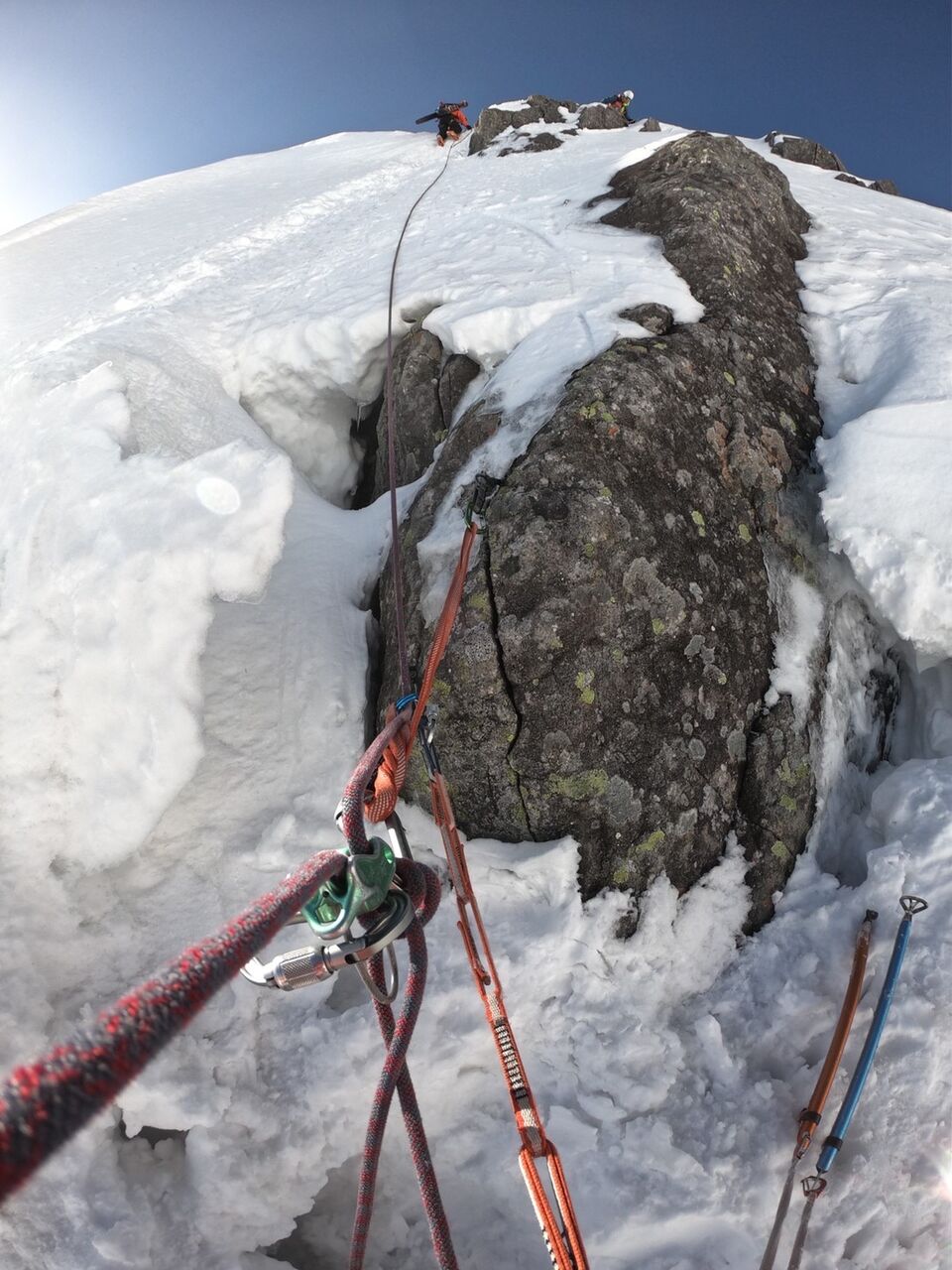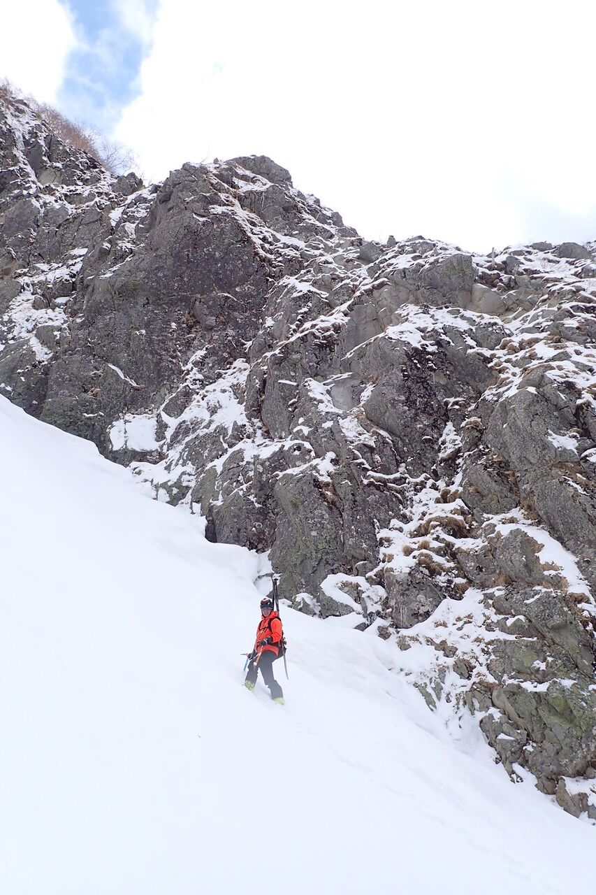 今回、稜線上もロープを出すようなところはなかったが、もっと雪が多ければロープを出したりしたかもしれないし、雪稜で確保点が思うように取れなかったりもすると思うので、ほんと条件次第なのだろう。