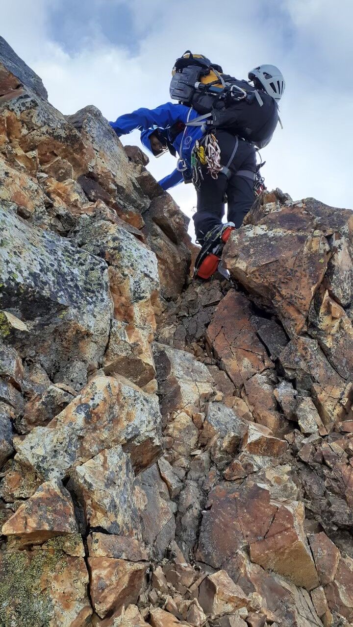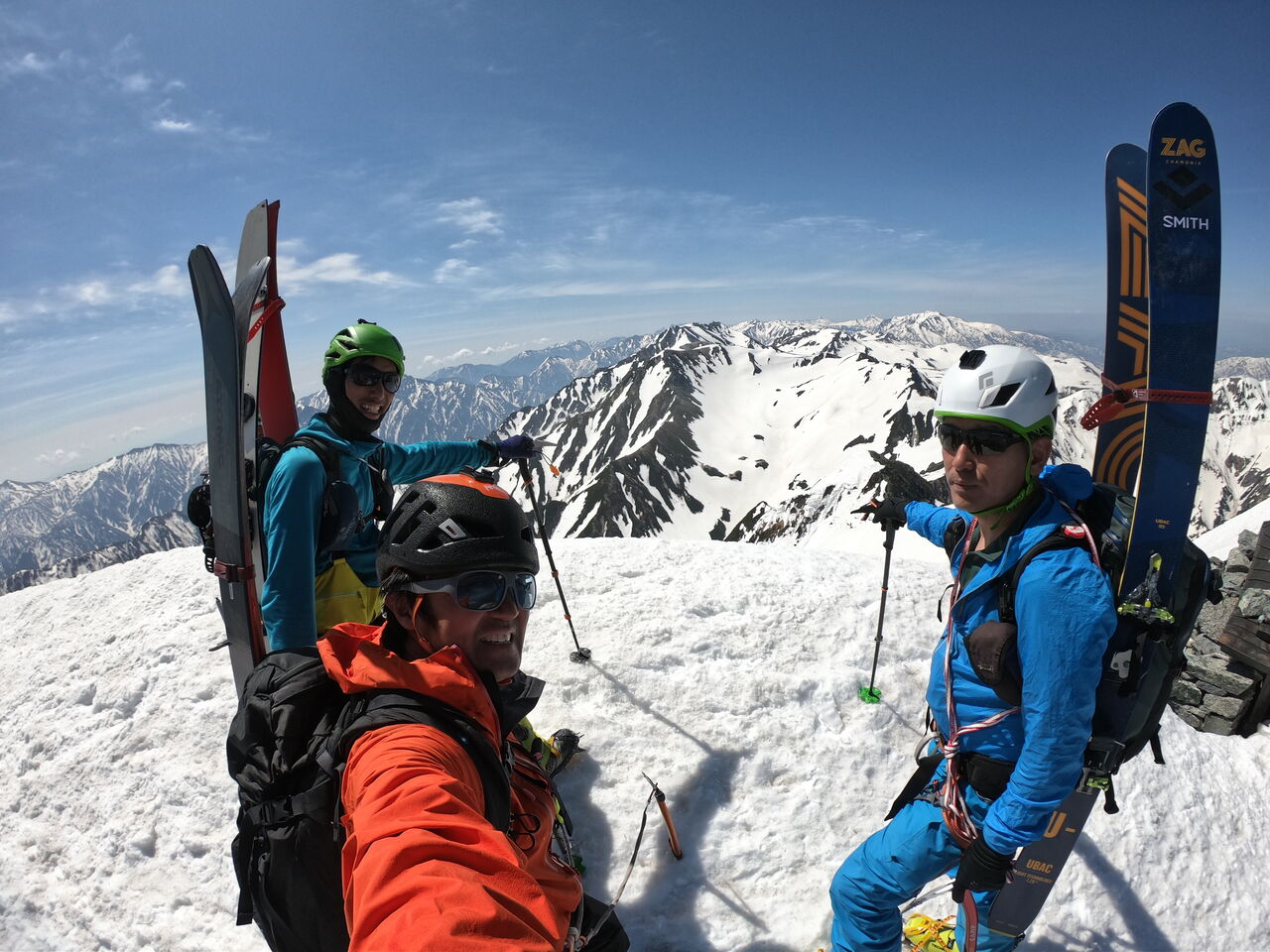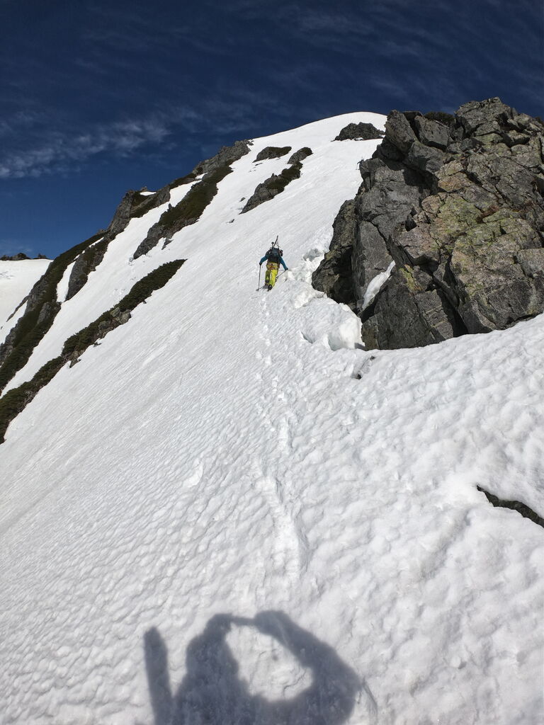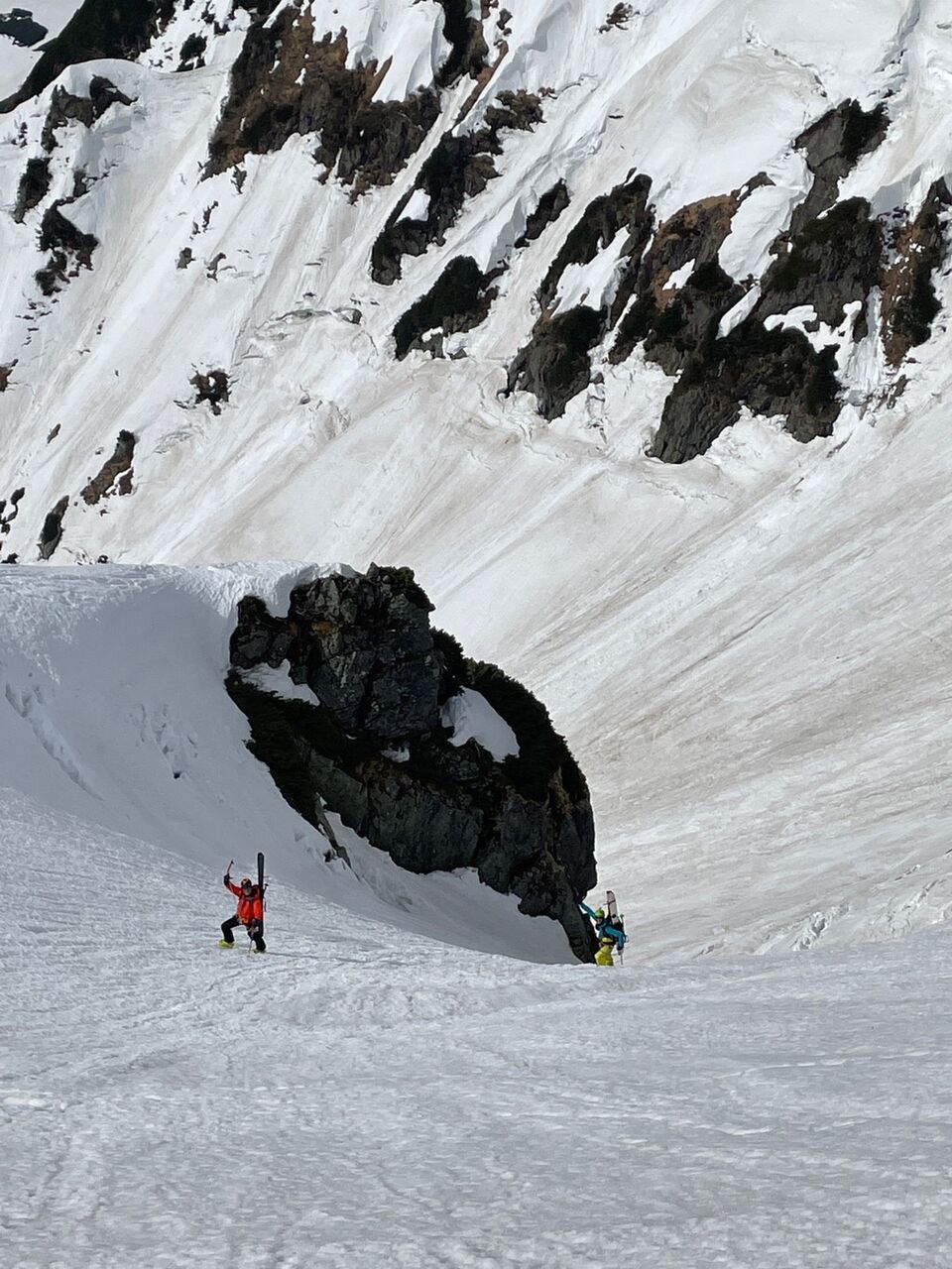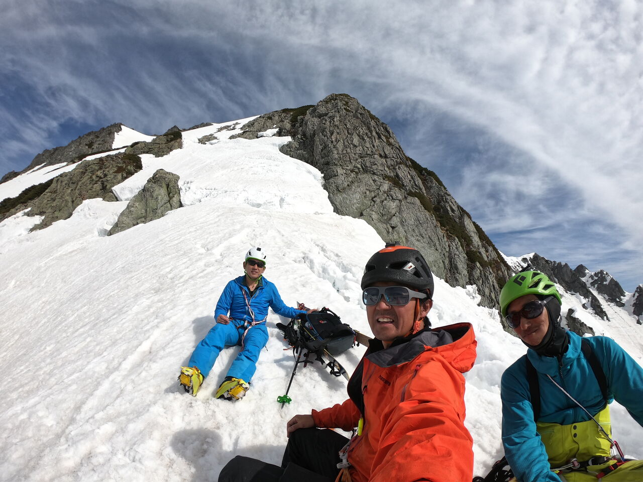 杓子岳山頂直下で尾根上の岩場を行くか、左手斜面をトラバース気味に行くか斜面の雪は腐り気味だしまあまあ斜度もあるので岩場を登ってPM17:15杓子岳山頂到着。