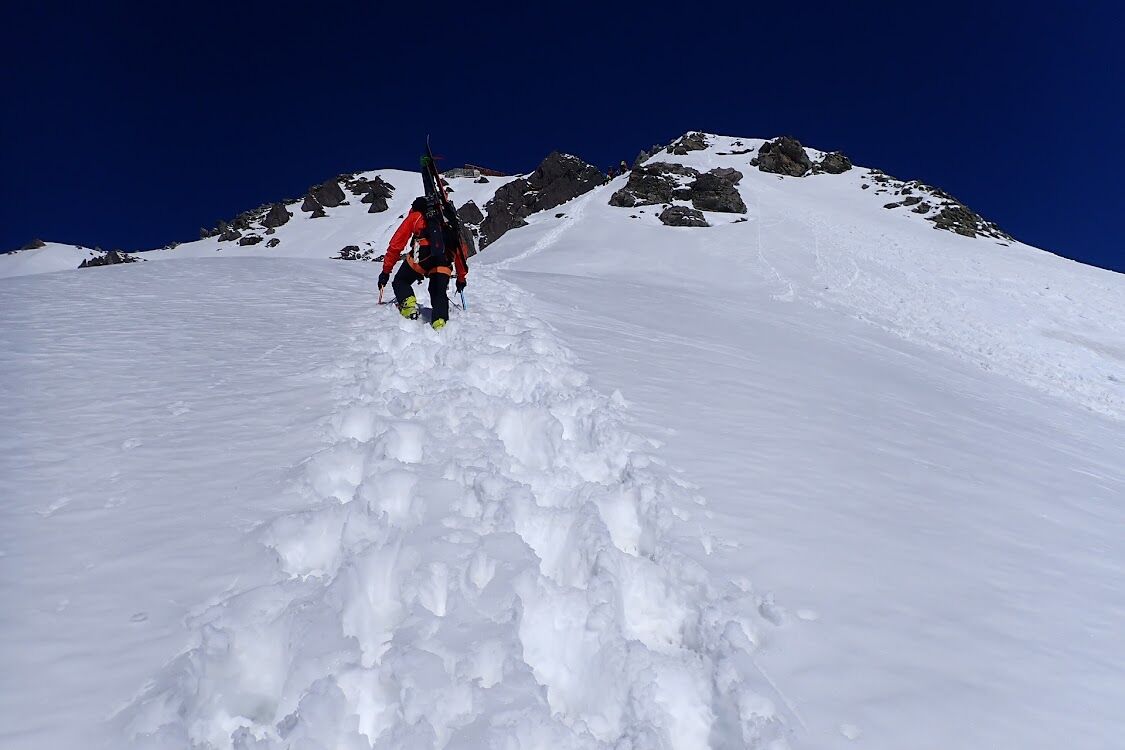2550メートルで双子尾根とのジャンクションピークに到達、双子尾根方面よりここから先はうっすらと踏み後もあるが、途中尾根上は融雪で藪漕ぎになるので右手の斜面、雪壁状をトラバースしたりする。