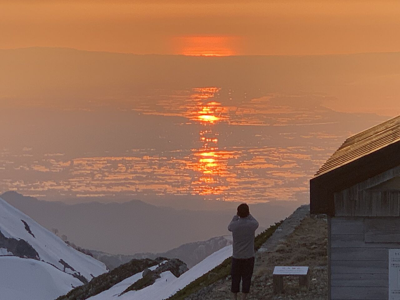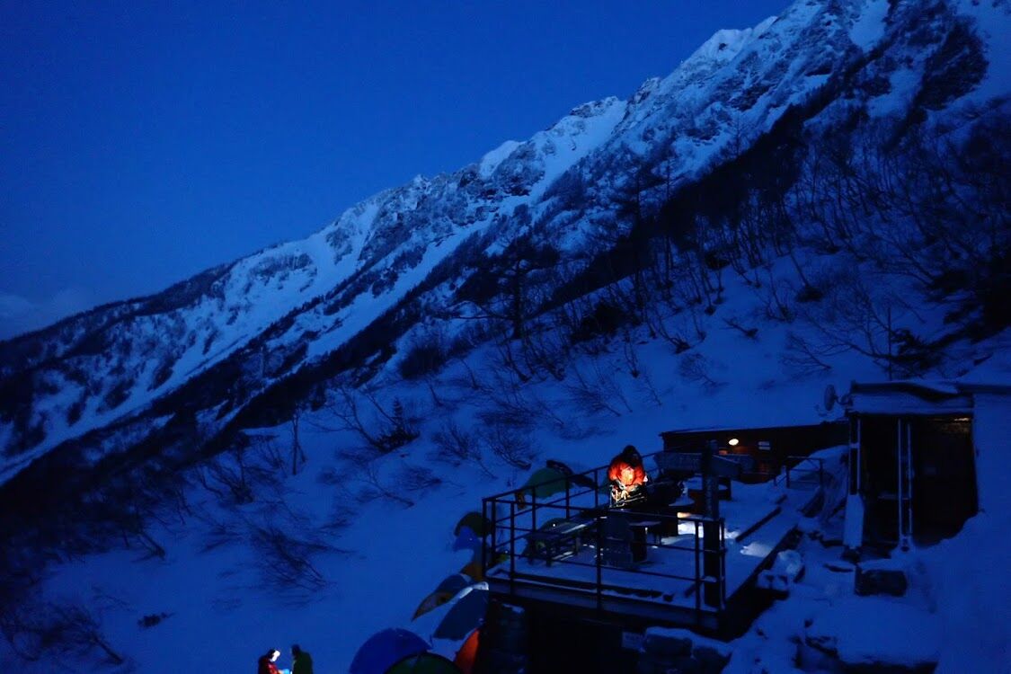 山頂から白馬岳までの稜線は夏道が繋がっているようなのでアイゼンを外して白馬岳頂上宿舎へ向けて歩く。日没時間も迫ってきていたので途中にあった雪原にて幕営。テントを立て終えた頃に丁度雨が降ってきてテントに潜り込む。ギリギリセーフ!!