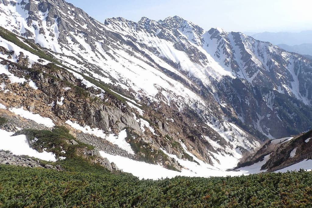 滝谷D沢は飛騨沢と槍ヶ岳山頂から目視できた。飛騨沢からはノドで雪が繋がっているか確認できなかったが、槍ヶ岳山頂からは雪が繋がっていることが確認できた5。これで滝谷D沢の雪が切れていることへの不安が一つ解消されて少し気が楽になった。