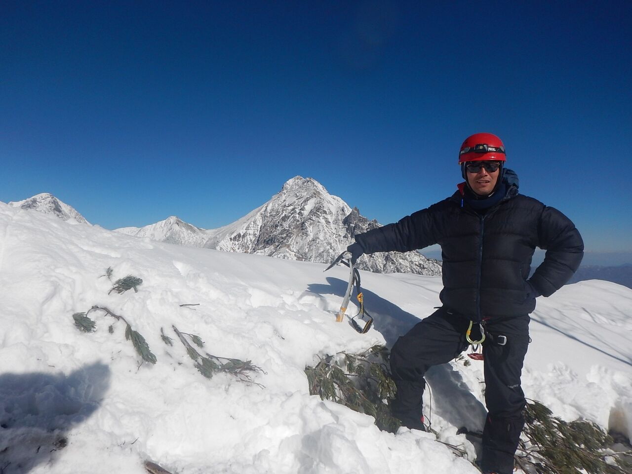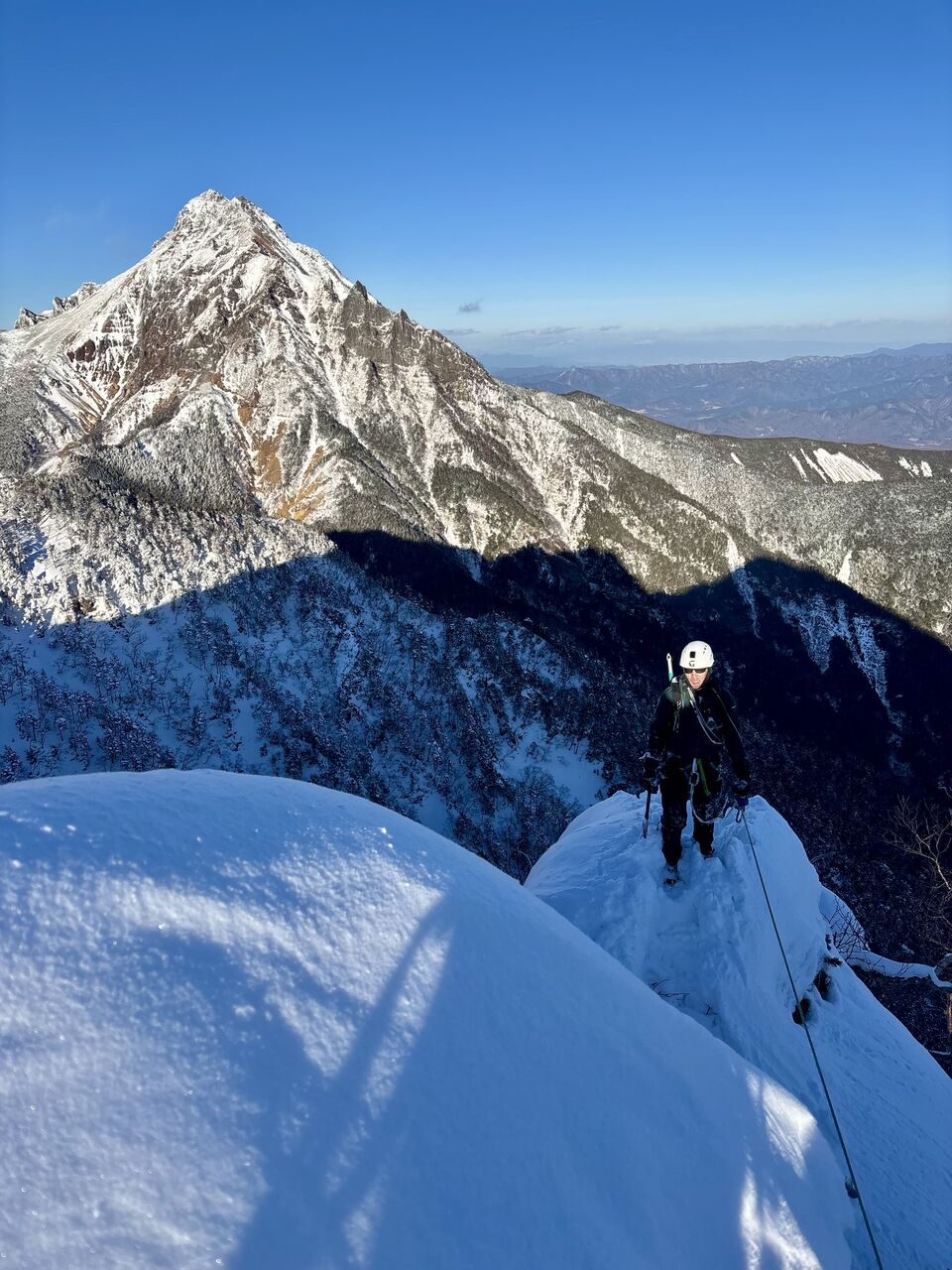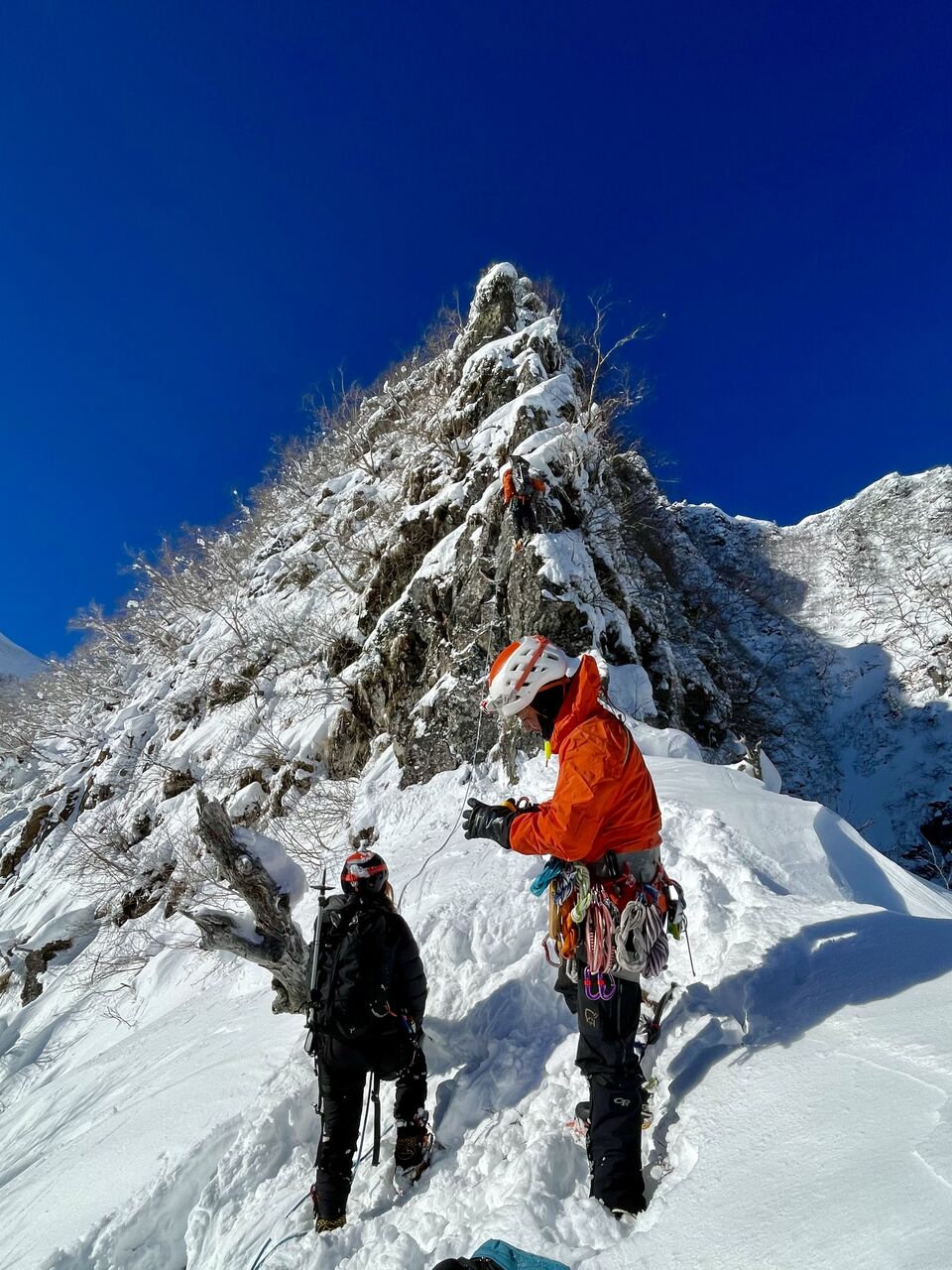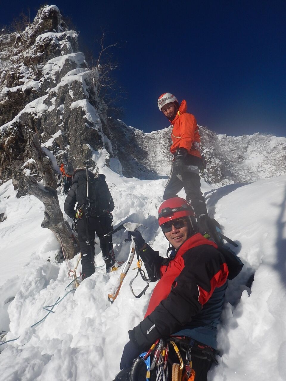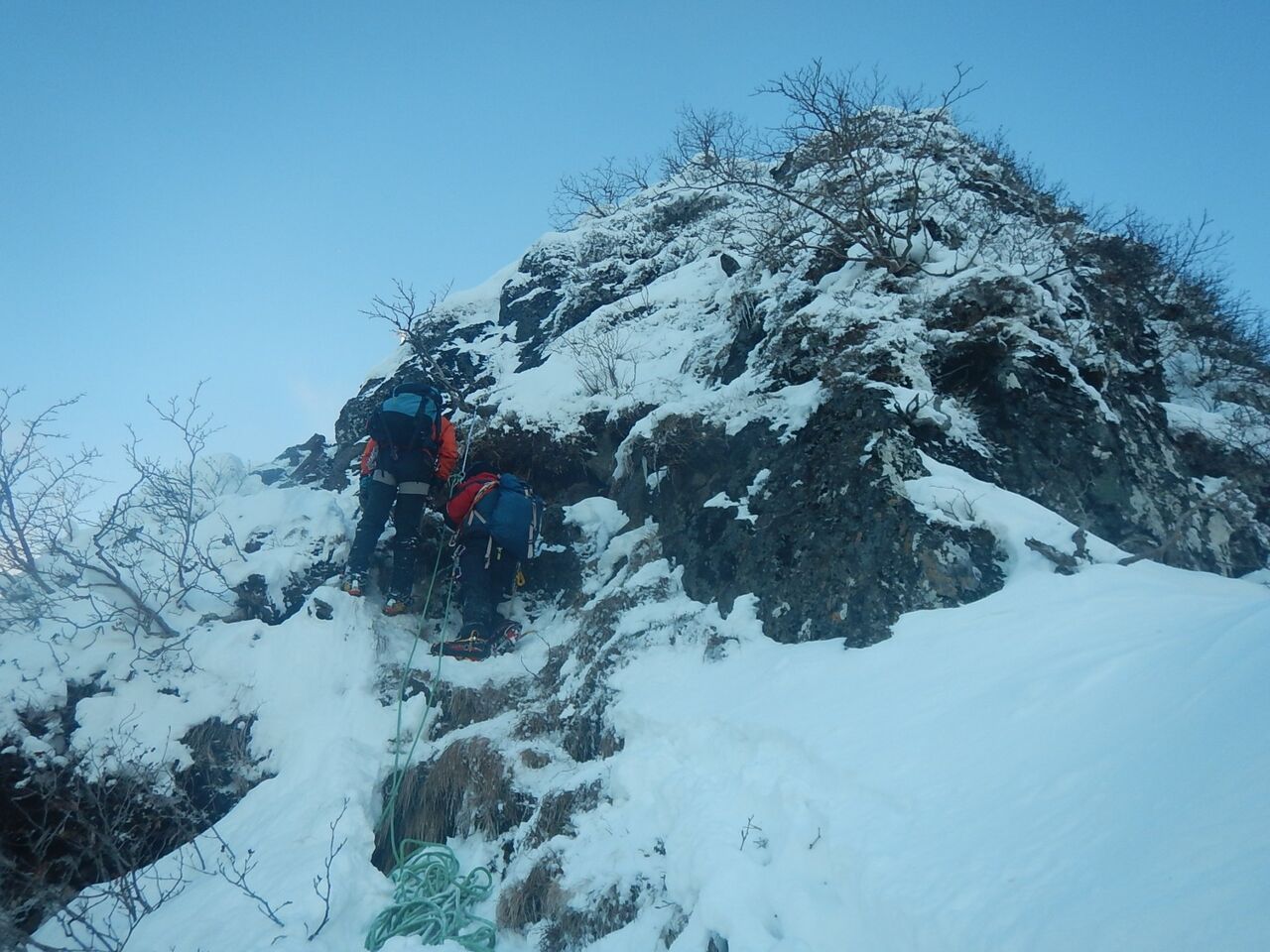 気合いを入れてバイル、アックス、予備のグローブ、ビレイパーカーまで持ってきたけど、雪なんて殆ど着いておらず、ドライで暖かい岩場だったので素手で登った。