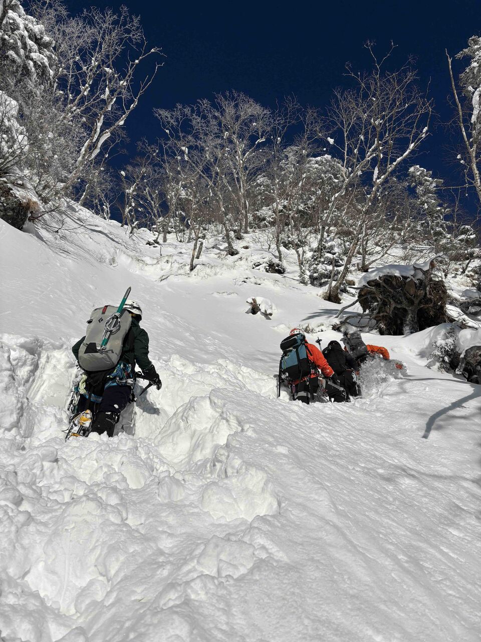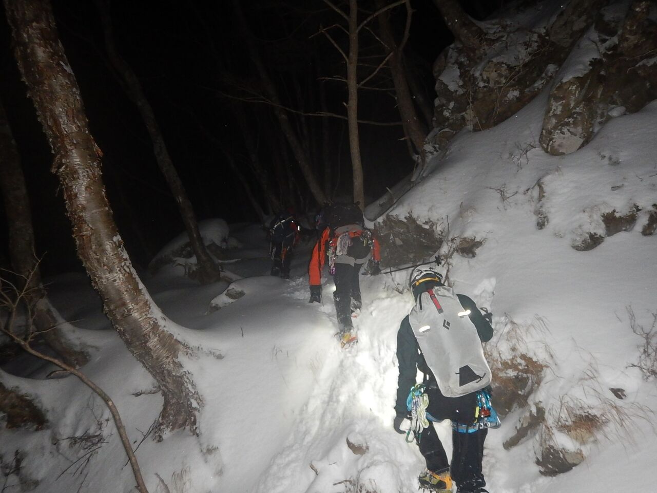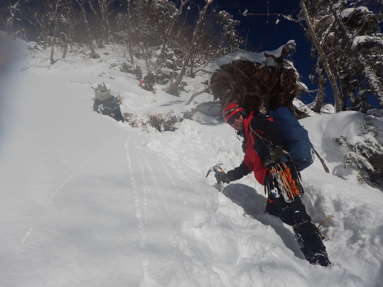 傾斜のキツい雪面をラッセルしながら取付きへと進む。