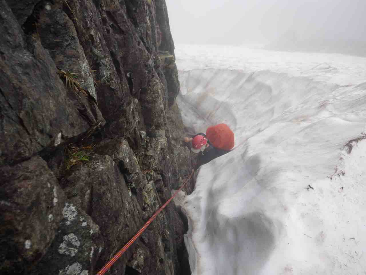 アイゼンをつけて照り返しが眩しい小窓雪渓をテクテク降りて行き、右岸に滝が見えるところあたりで人に出くわし、左岸の縦走路の入り口を教えてもらう。完全に見逃していた。危ない危ない。