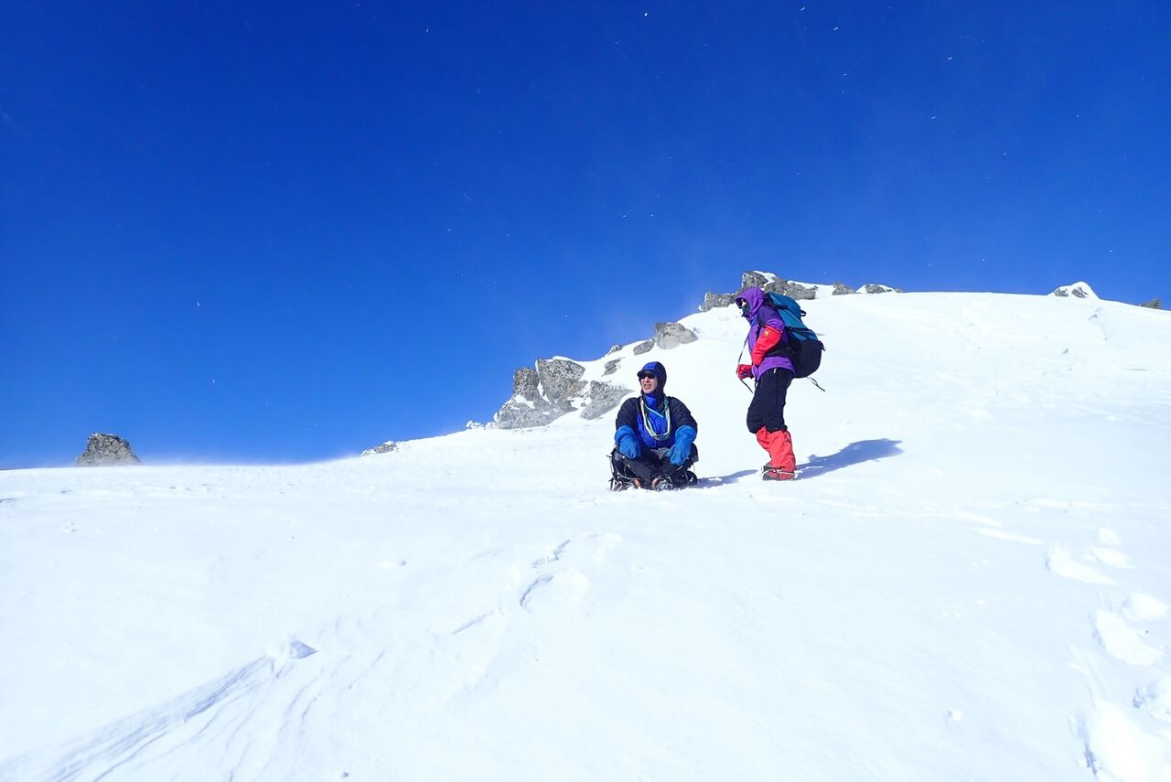 スラブ状の岩を馬乗りで乗っ越すと2mほどのナイフリッジの雪稜になる。ナイフリッジの先は、最初藪がうるさいがすぐに快適な雪壁になる。そのまま雪壁を登り高度を上げて行くとサギダル尾根の頭に到達した。終了点はハイマツでとった。