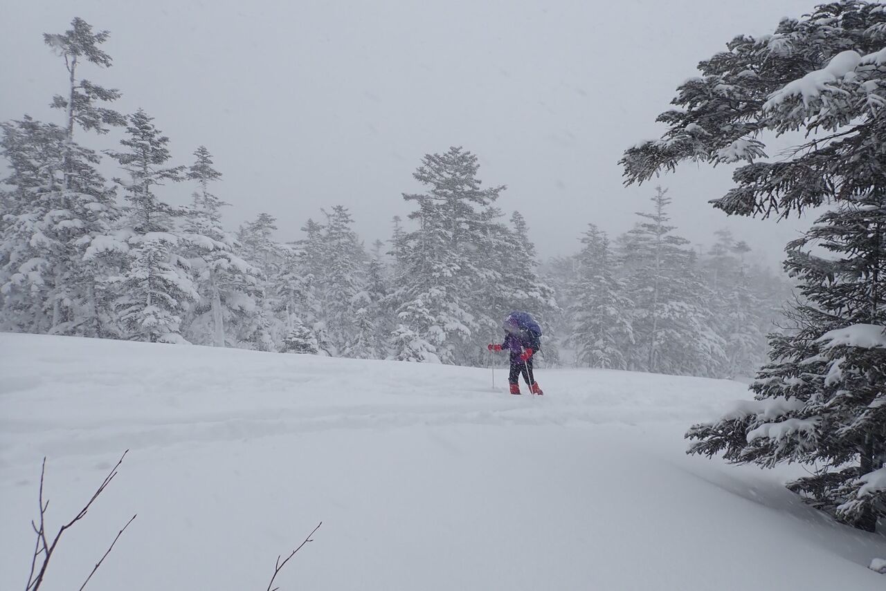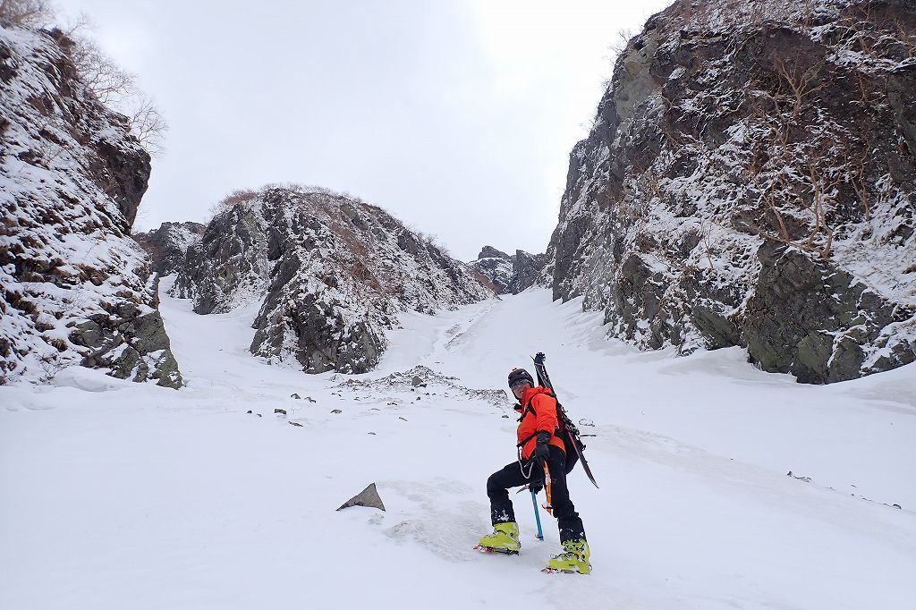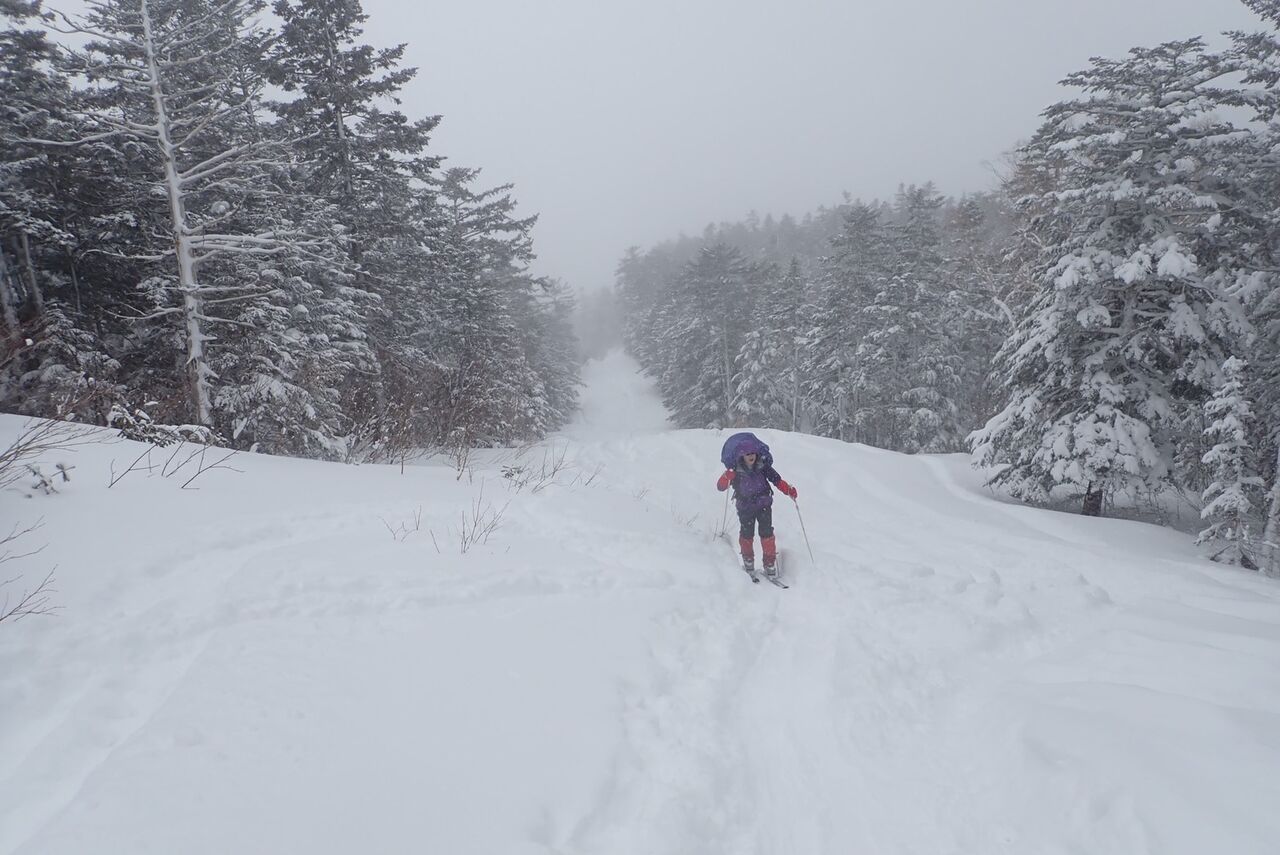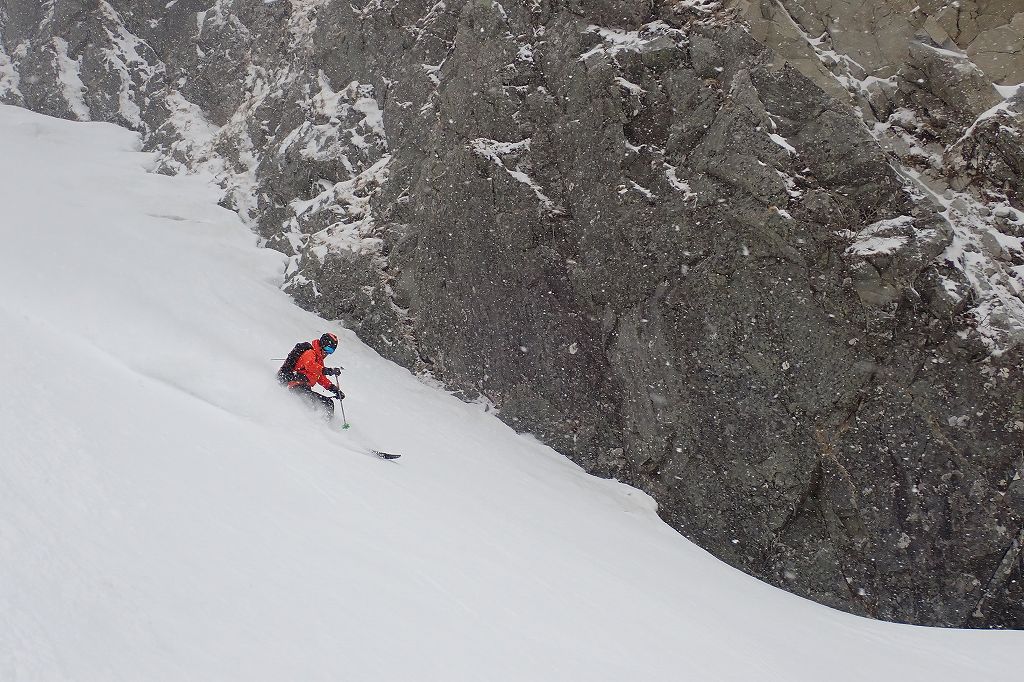 サギダル尾根の頭につくとすっかり天候は悪化し、雪がパラついてきた。最短で降りられる滑降ルートであるサギダル尾根の北側のルンゼを選択した。サギダル尾根の頭から右側の稜線を進み、最初に右手に見えるルンゼである。ドロップポイントは比較的広く滑走準備には支障ない。到着して思い出したが、このルンゼは2013年の木曽駒ヶ岳北面1の翌日に滑降したことがあった。