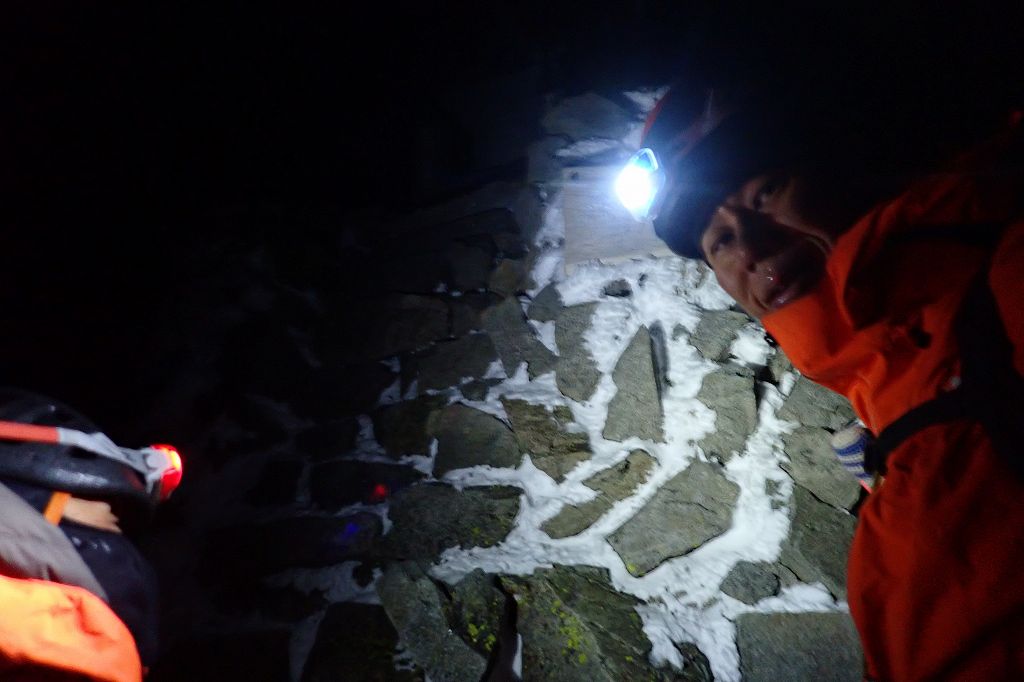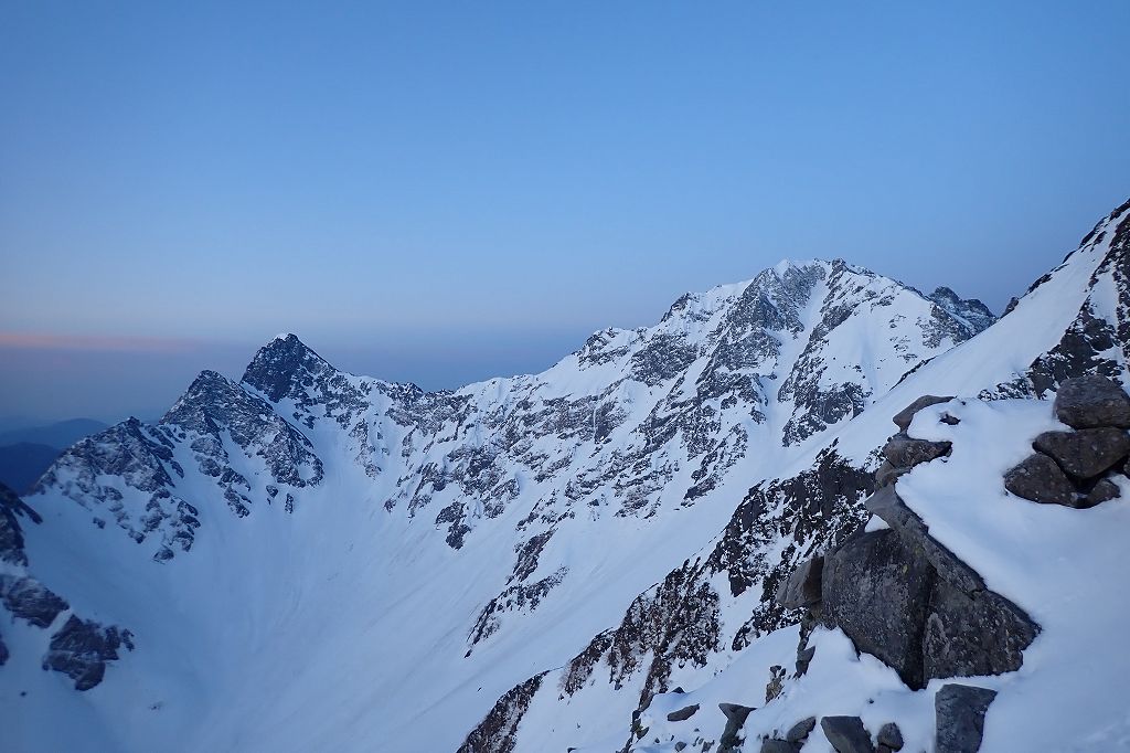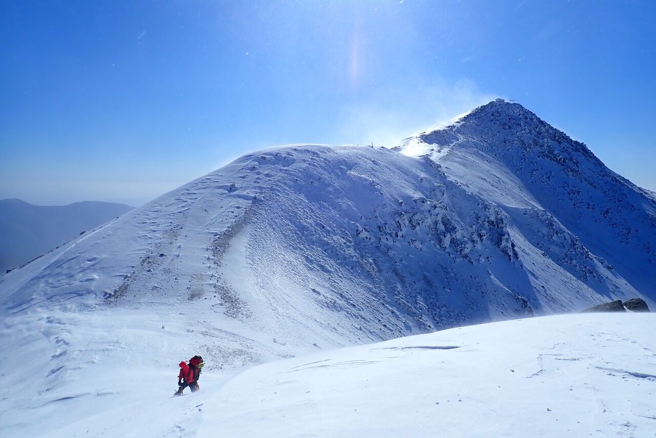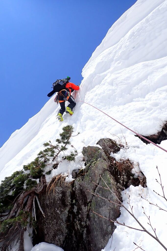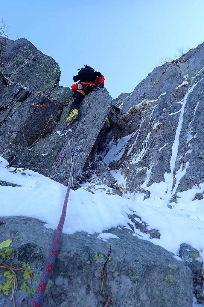 ハイマツのある尾根の先にある岩稜帯に向けて登った。岩稜帯に乗り上げるのが核心か。アイゼンやアックスをかける場所が少なくていやらしい。なんとか登りきり、その先のスラブ状の岩の上部にあったワイヤーでピッチを切った。