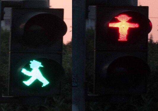 東西ドイツが統一されたとき、殆どすべての規格や規則は、当時の西ドイツのものに合わせられましたが、数少ない例外として残ったのが「歩行者信号機のシンボルマーク」です。Ampelmännchen (アンペルメンヒェン:信号の小人)と言われるシンボルマークは、東ドイツのほうが可愛いということで保存を望む声が東西ドイツで巻き起こり、結果としてその声が届いて今日に至っています。今ではそのグッズがベルリンの代表的な土産物になっています。