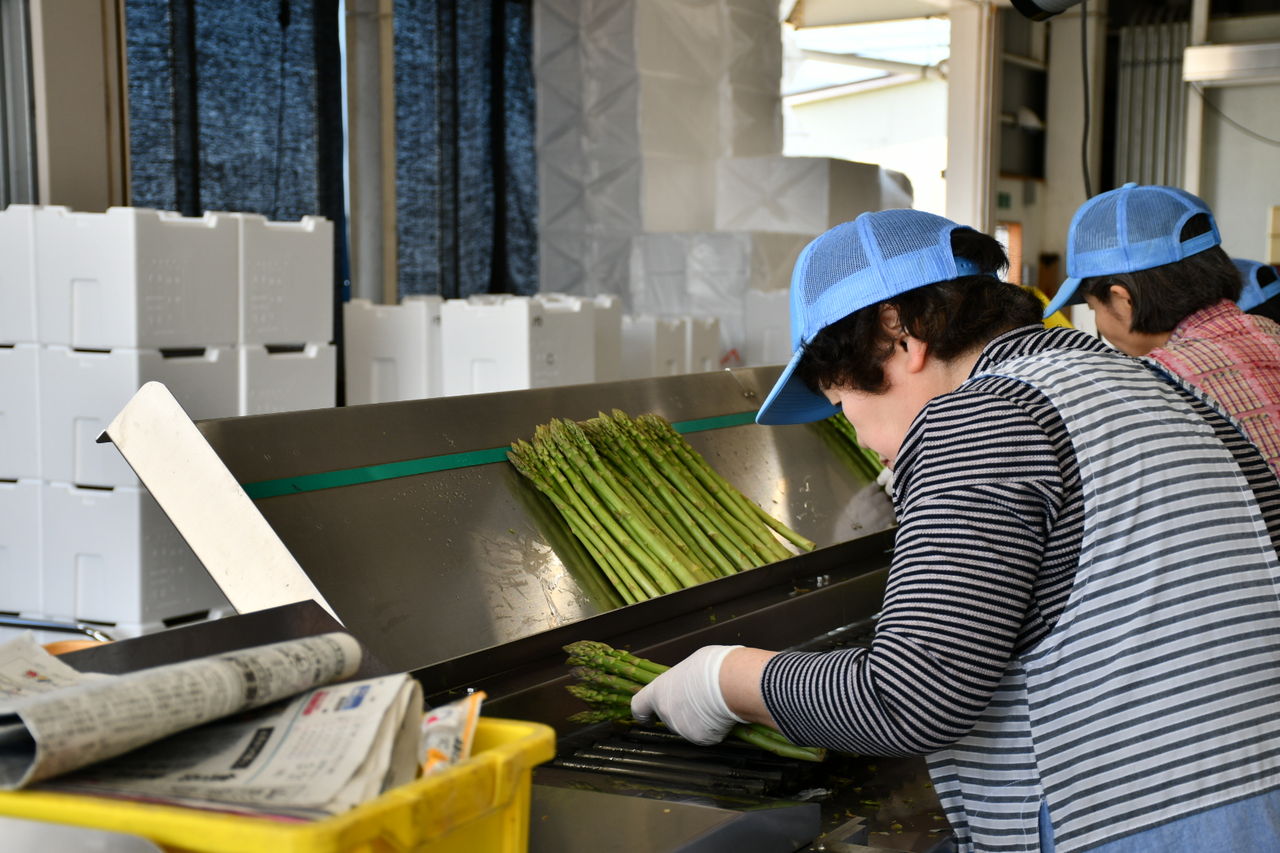 収穫したアスパラは選果場にてサイズごとに自動で選別されていきます。