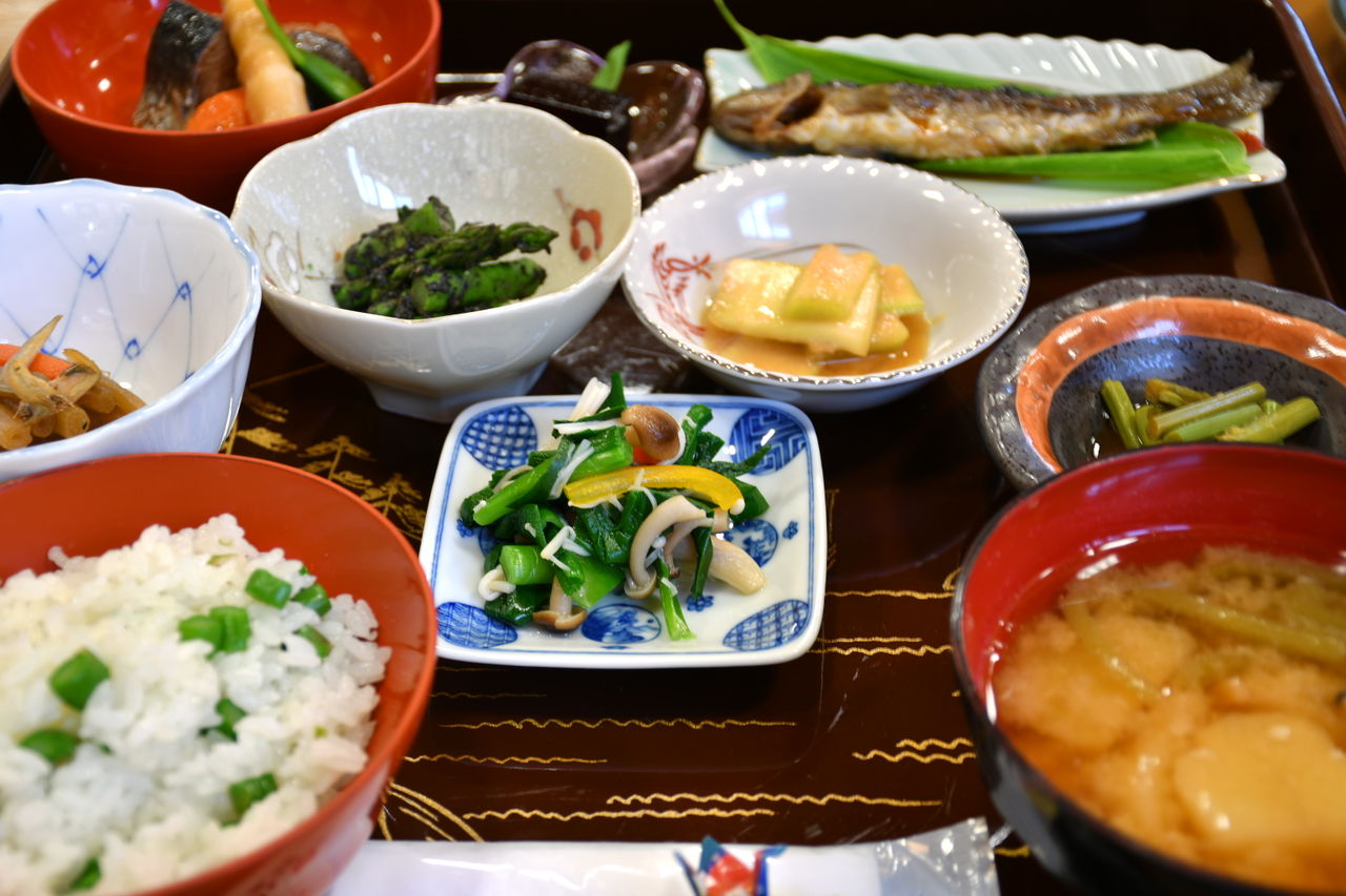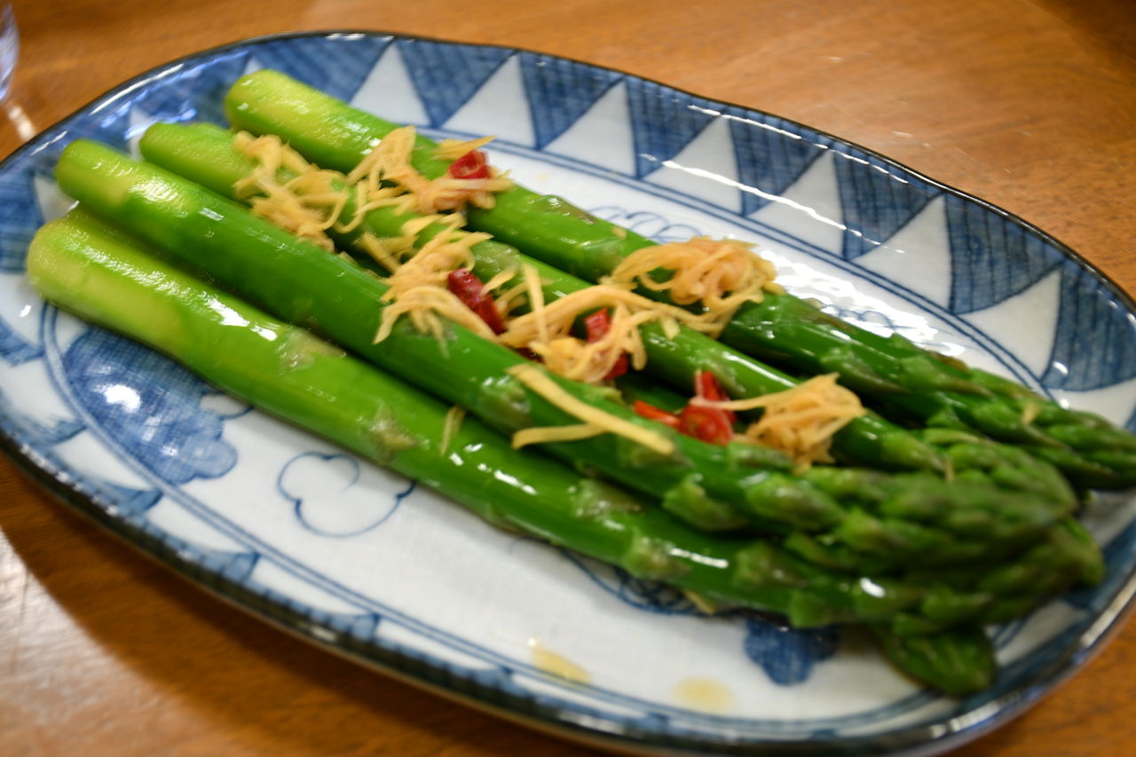 アスパラご飯、アスパラの胡麻和え、ニラのお浸し…
