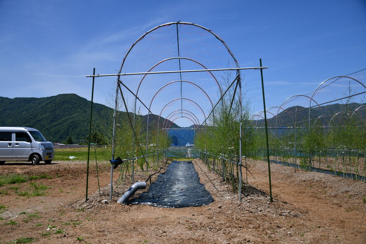 アーチを立てて、アーチに沿うようにアスパラの親株を育てます。