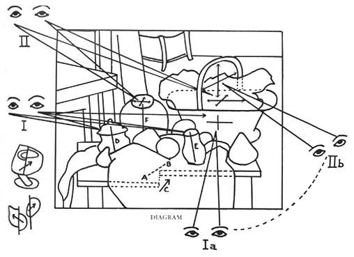 2) 2つ目は、ピカソとブラックによる空間の破壊と再構成です。ピカソとブラックは、さまざまな視点から事物を観察して、画面上に再構成する「キュビズム」と呼ばれる手法を確立しました。