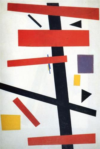 「シュプレマティズム(絶対主義、至高主義)」とは、マレーヴィチが1910年代半ばに体系化した芸術理論です。シュプレマティズムでは、唯一絶対的な美は人間の感覚の中にあると考えます。このため自然を模倣した絵画を否定しました。さらに、芸術の自由と自立性を目指し、対象物を描くこと自体も否定してしまいます。このような絵画を「無対象絵画」と呼びます。対象物を描くという制約から解き放たれた絵画は絶対的自由を獲得するとマレーヴィチは考えました。