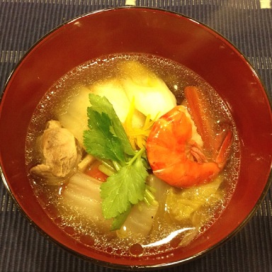 具材は、鶏肉・白菜・椎茸・人参・海老・三つ葉。