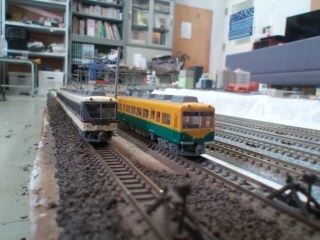 最後に、現在制作中のレイアウトにて撮影した、KATOの381系と富山地方鉄道モハ14760形の写真です。