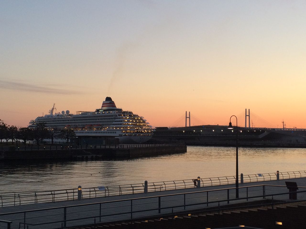 朝焼け、飛鳥Ⅱと横浜ベイブリッジ