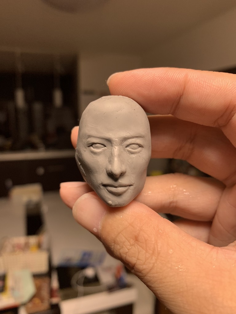 作り直すにあたっては、このフィギュアの顔をおゆまる(熱っすると柔らかくなり冷えると固まるプラスチック粘土)で型を取り、そこにスカルピーを詰めて、そこから造形を修正していくという手法で始めました。