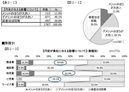 東京商工会議所が今年2月に会員企業を中心とした中小企業等3492社を対象に行ったアンケートによると、およそ半数にあたる49.1%の企業が「円安によるデメリットのほうが大きい」と答え、更に、輸出を行っている企業でも「メリットのほうが大きい」と答えた 企業は約3分の1(36.4%)しかない。その理由は、海外の景気が低迷していて需要が伸びず、輸出額を増やせていないという状況だという。