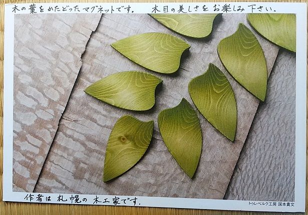 こちらは木製の木の葉をかたどったマグネットの絵葉書です