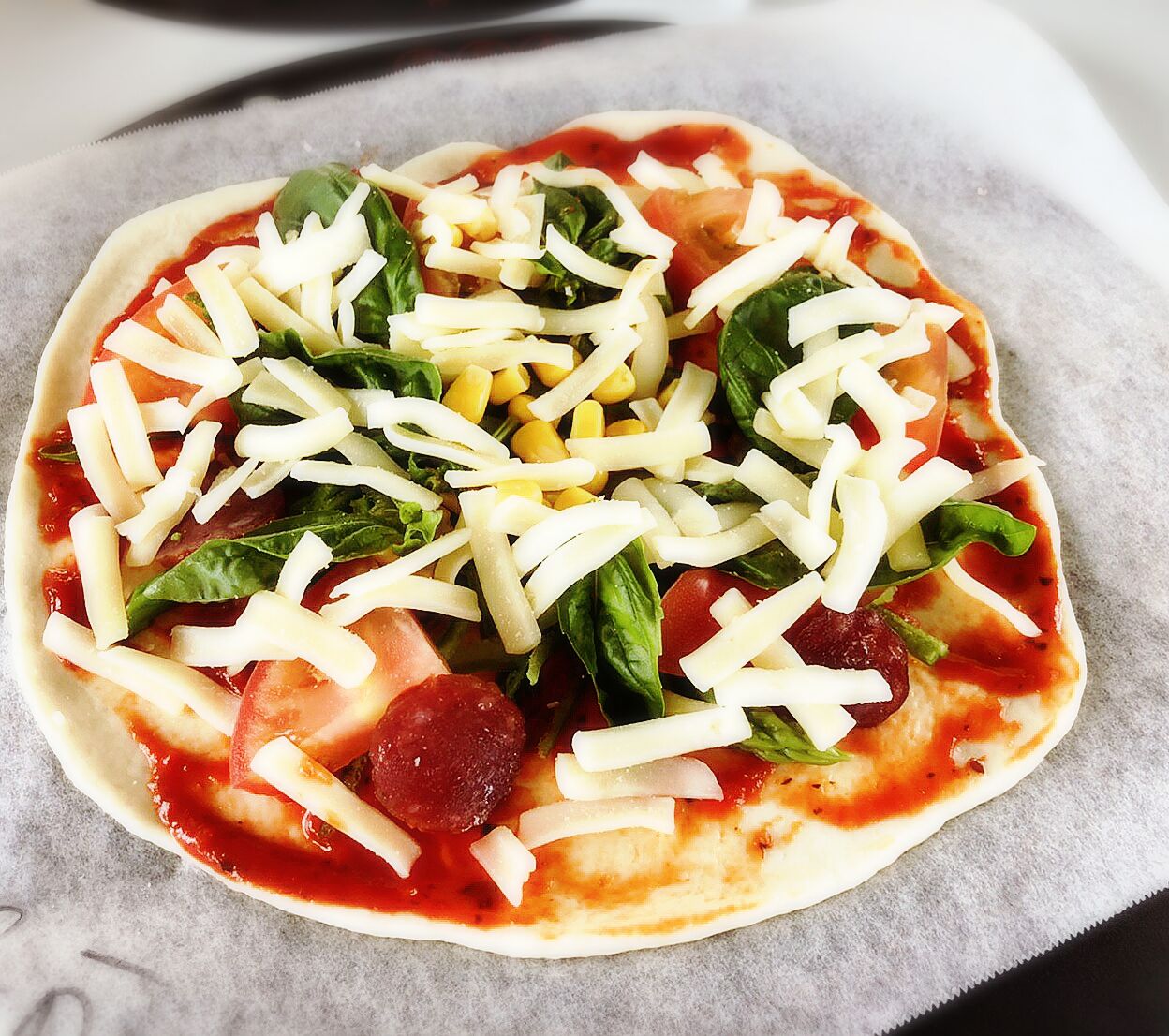 次はお待ちかねのピザ作り。米粉配合のピザ生地に、当農園で採れた野菜をトッピング。