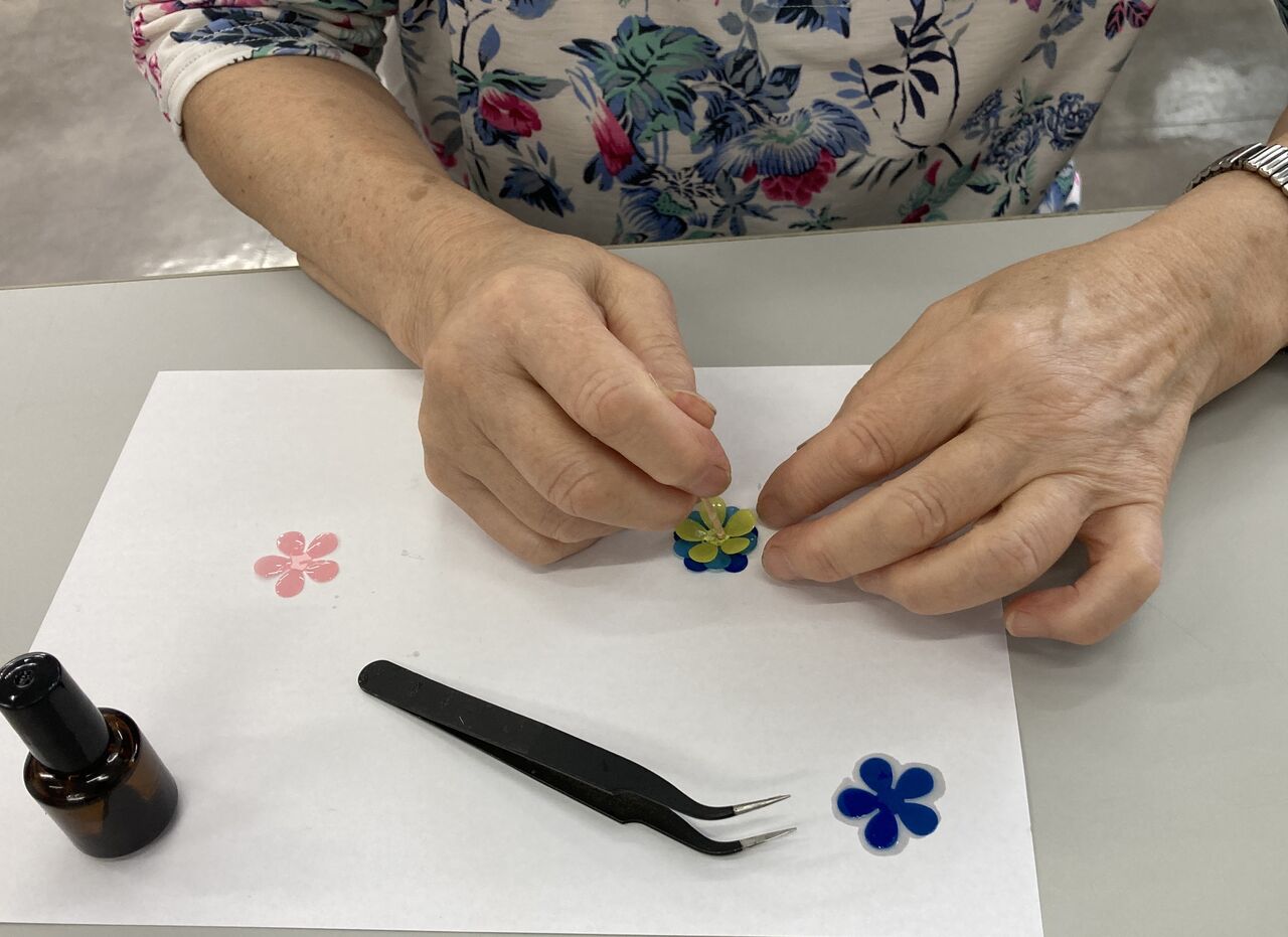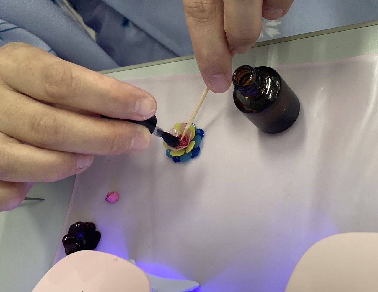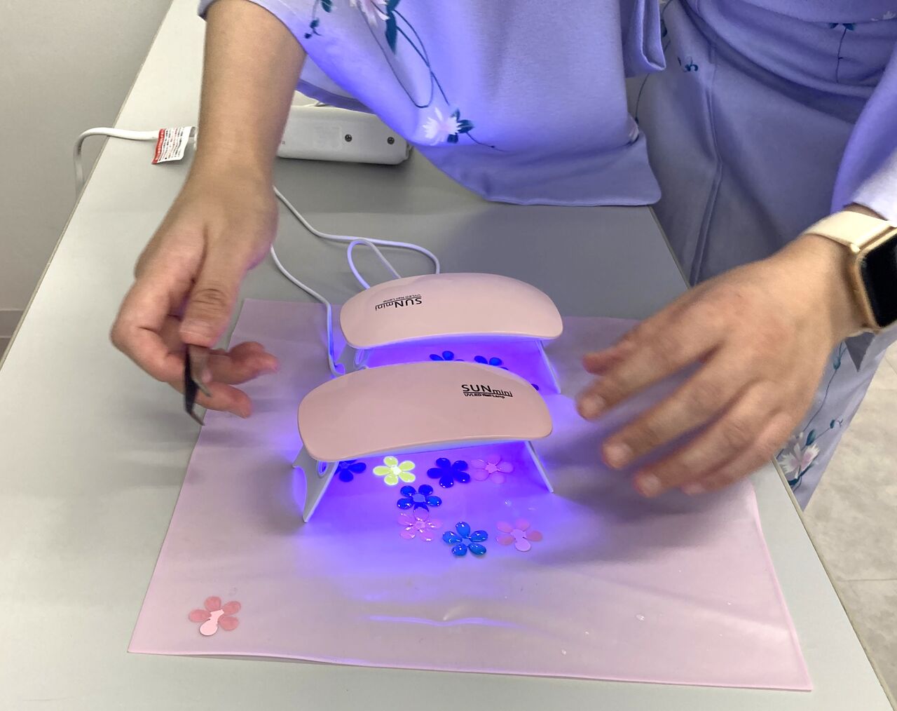 花芯を付けたら、レジン液を隙間に塗り、UVライトで固めて仕上げます。