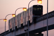 夕焼け空を背景に、走行する多摩モノレール