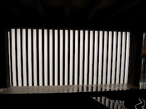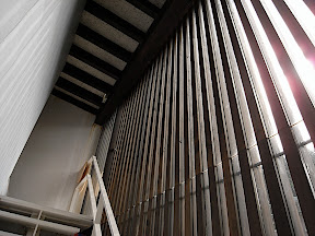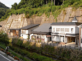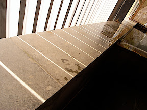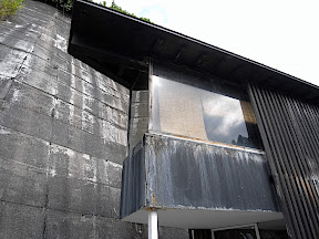 外装のルーバーもだいぶひなびて、いい雰囲気。奥に出ている庇周りのディテールなんて、だいぶ凝ってますよ。隈さんのディテール集参照。