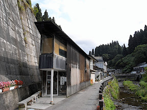 銀山温泉は山あいの川の両岸に約300mくらいの長さで旅館が連なるこじんまりとした温泉街。隈研吾設計のしろがね湯はその一番手前、温泉街の端にあります。