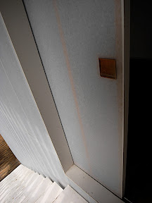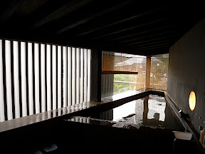 同見下ろし。左側の磨りガラスと木のルーバーの取り合わせといい、右側のスクリーン(和紙+FRPだったか?)といい、細かい仕事です。視触覚としても実触覚としても柔らかく、これから裸になろうという空間にはちょうどよいですね。また陰影がいい。