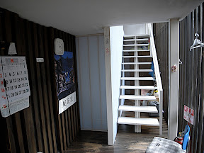 着替え場。裏は断崖の擁壁で採光がとれないので、川側をルーバーで全面開口とし、和紙の壁材による透過光で採光を確保している。うまい!