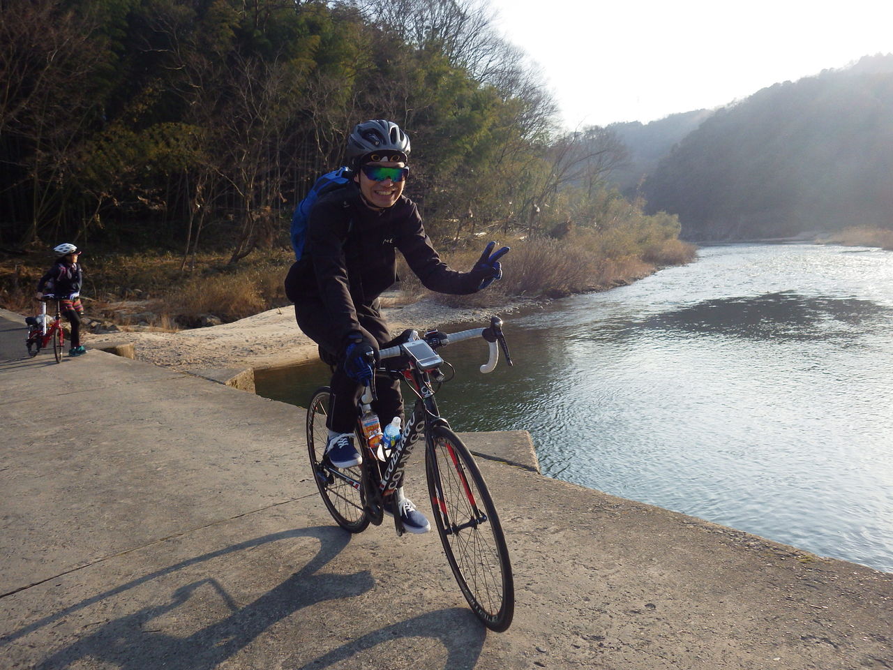 川越さんが、沈下橋で木津川を越えます。