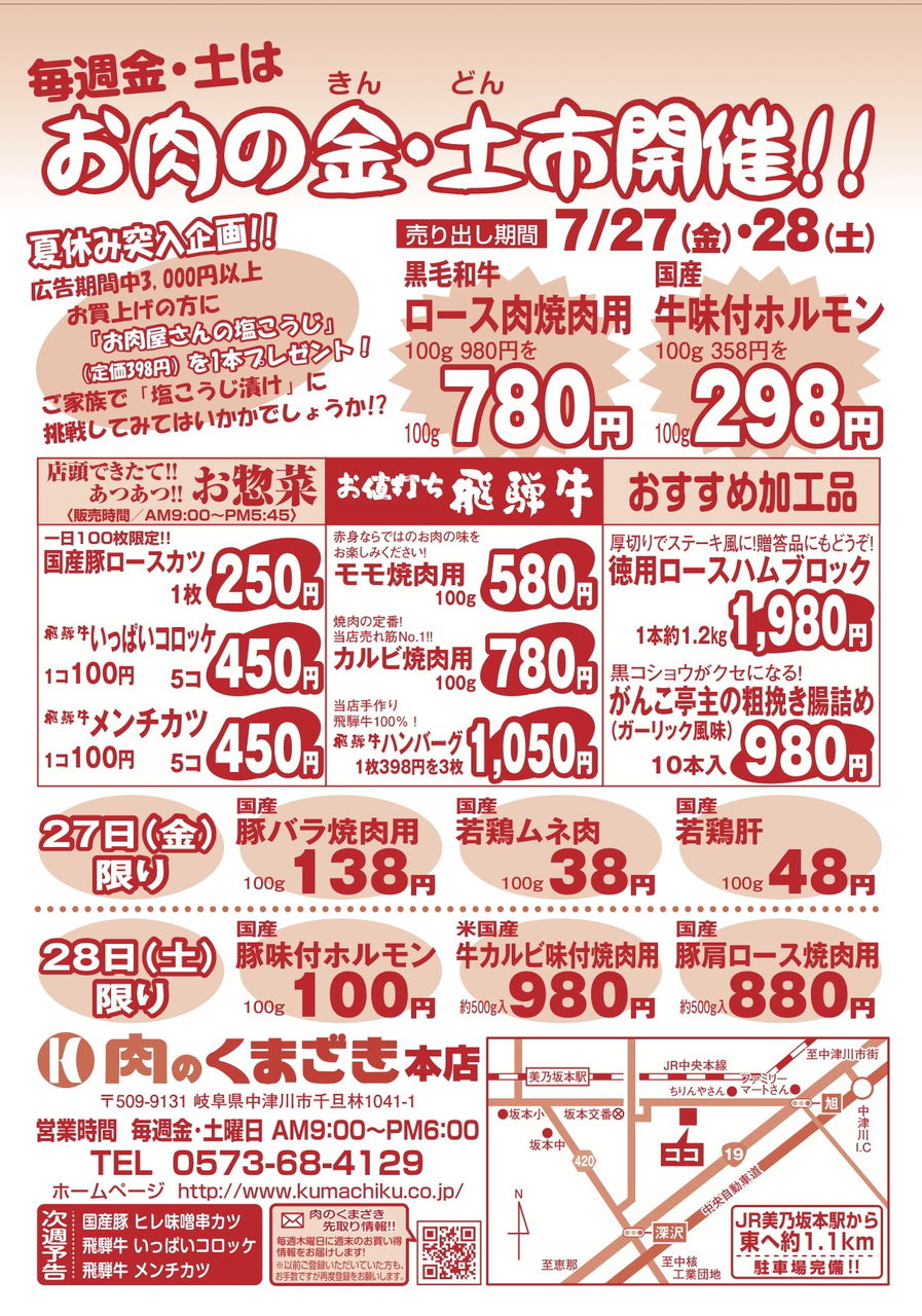 2012年07月20日 今日と明日の広告です。 (肉のくまざき本店) コメント数:0 コメント カテゴリ:経営飛騨牛 by kumatiku 今日と明日の肉のくまざき本店の広告です。総菜は「手羽元からあげ」です。 皆様のお越しを心よりお待ちしております。