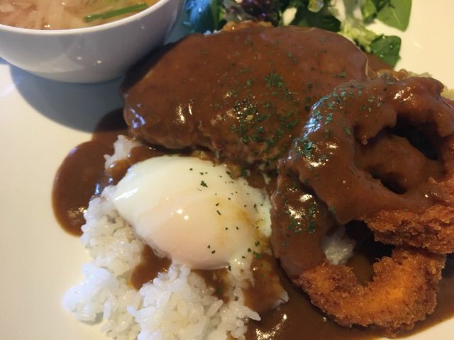ハンバーグに選べるトッピングはイカリングフライにカレーソース。