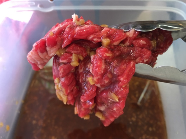 スジ切りした国産牛のモモ肉が甘めのにんにくダレによく絡み昔から人気の商品です。