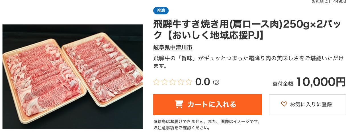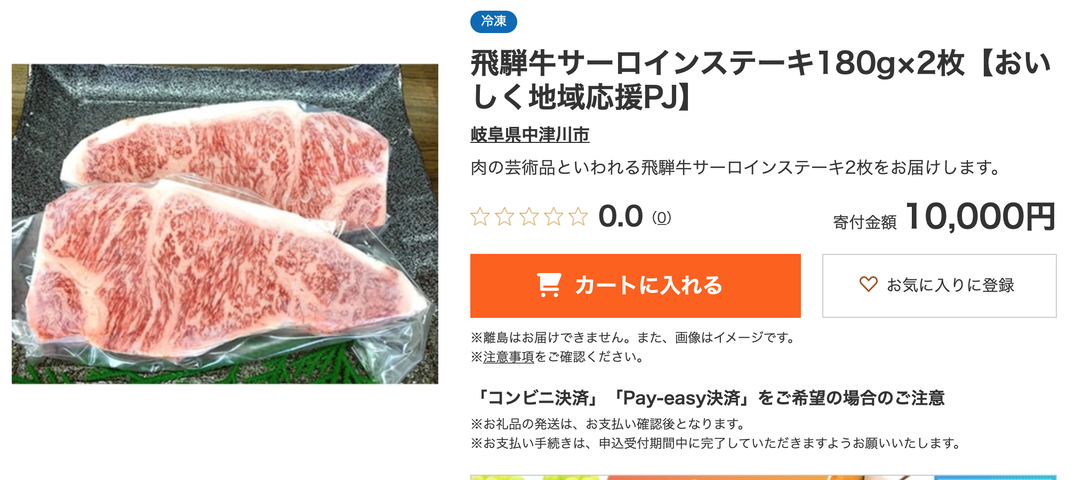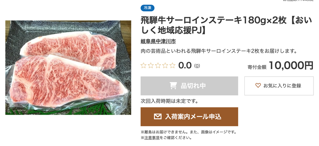 「おいしく地域応援プロジェクト」ですが、岐阜県中津川市の肉のくまざきが出品している返礼品のうち、「飛騨牛サーロインステーキ180gx2枚」が早くも予定数量に達したため品切れになりました。