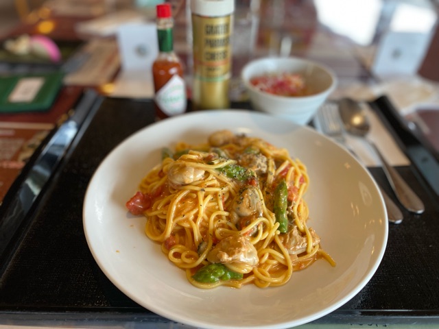 お昼にいただいたのは「牡蠣のトマトクリームパスタ」。食事付きメニューで追加料金無し。