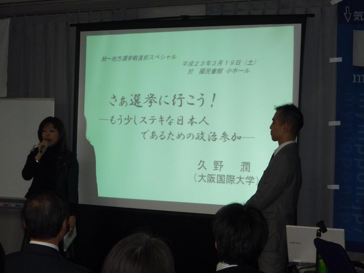 ¡¡Ãë¡¢Âçºå¾ë¡Ê¼Ì¿¿¡Ë¤Î¥É¿¿¤óÁ°¤Ë¤¢¤ë¹ṉ̃²ñ´Û¤Ç¹Ö±é¤¹¤ë¡£¥¿¥¤¥È¥ë¤Ï¡Ö¤µ¤¡Áªµó¤Ë¹Ô¤³¤¦¡ª ¡Ý¤â¤¦¾¯¤·¥¹¥Æ¥¤ÊÆüËܿͤǤ¢¤ë¤¿¤á¤ÎÀ¯¼£»²²Ã¡× ¡½¡½ ¼çºÅ¼Ô¤Î£í£ùÆüËܤµ¤ó¤«¤é´ØÀ¾¤Ç¤ÎÂ裱²óÊÙ¶¯²ñ¤È¤·¤Æ¼ã¼Ô¤¿¤Á¤¬º£²ó¤ÎÅý°ìÃÏÊýÁª¤ÇÁªµó¤Ë¤É¤Î¤è¤¦¤Ë´Ø¤ï¤Ã¤¿¤é¤¤¤¤¤«¡ÊˡΧ¾å¤ä¤Ã¤Æ¤Ï¤¤¤±¤Ê¤¤¤³¤È¤Ï²¿¤«¡Ë¤Ë¤Ä¤¤¤Æ°·¤¤¤¿¤¤¤ÈÁêÃ̤µ¤ì¡¢¤½¤ì¤Ê¤é¤Ð¤à¤·¤í͸¢¼Ô¤È¤·¤Æ¤Þ¤ºÁªµó¤Ë¹Ô¤¯ÂçÀÚ¤µ¤ò¥á¥¤¥ó¤Ë¿ø¤¨¤Æ¤ä¤Ã¤Æ¤ß¤Þ¤·¤ç¤¦¤ÈÄ󰯤·¤¿¤â¤Î¡£¡¡£µ£°Ì¾¶á¤¤»²²Ã¼Ô¤òÁ°¤Ë¤·¤Æ¡¢£±»þ´ÖȾ夤¤¿¹Ö±é»þ´Ö¤ÎÃæ¤Ç
