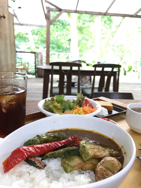 「カヌー工房」にて町の野菜を使用した夏野菜キーマカレーを大盛りで。