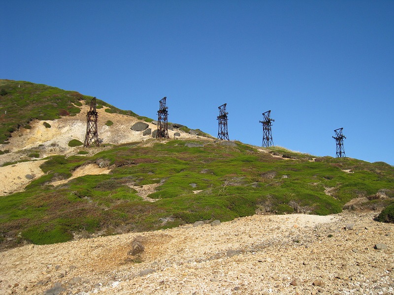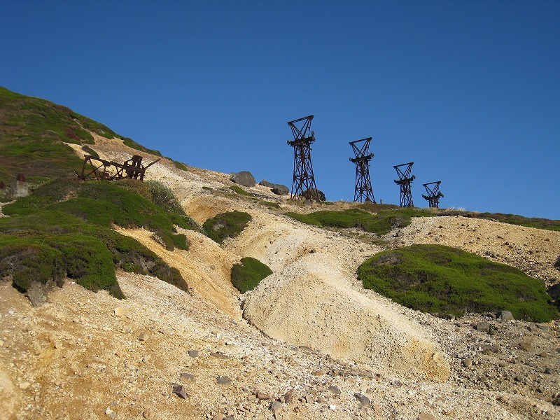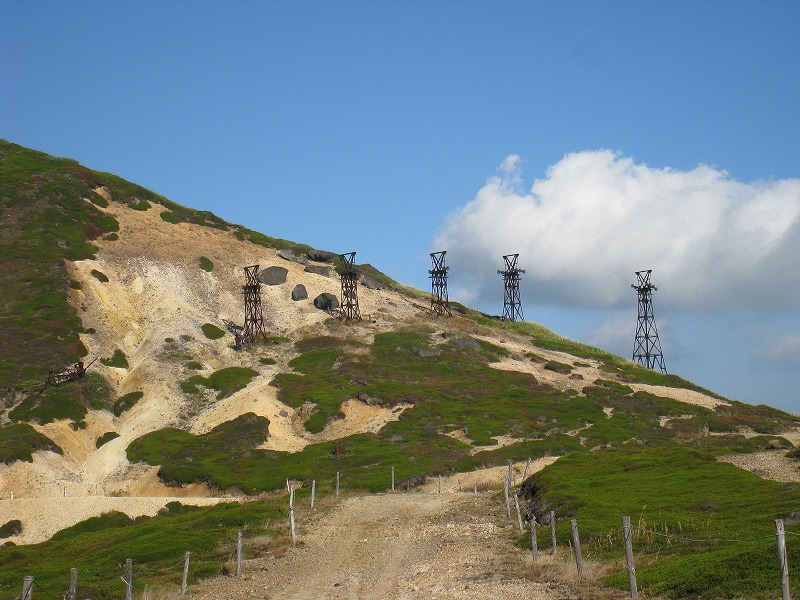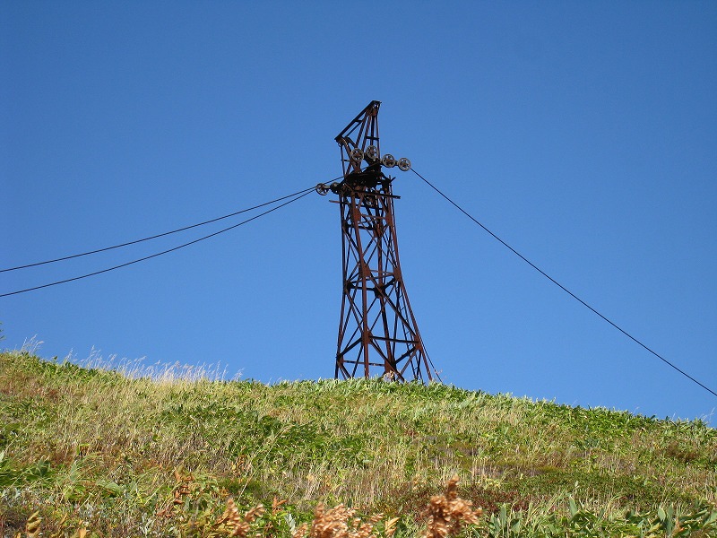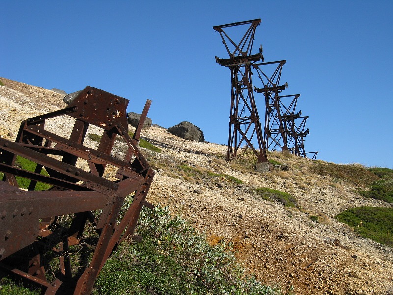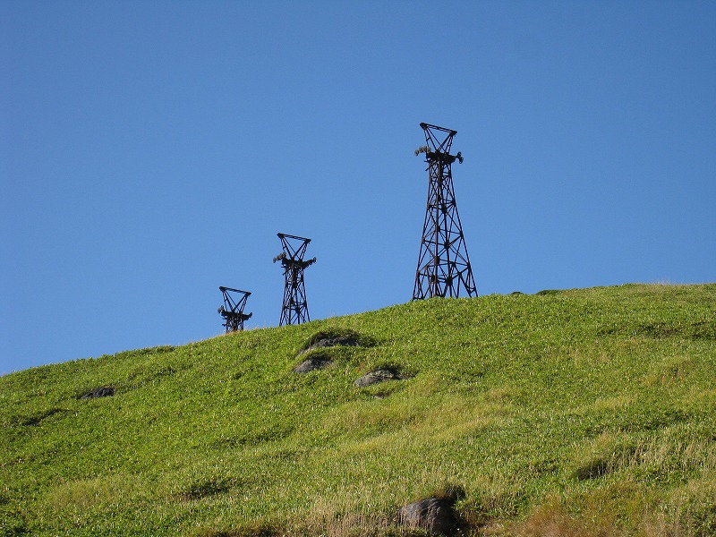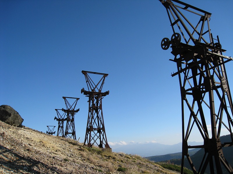 2008年10月2日探訪 標高2000m近い高所にある硫黄鉱山の跡。 鉱山から掘り出した硫黄を、この索道を使い長野県須坂側に送り、 帰りは生活物資を積んで帰って来たそうだ。 全景 一番手前の鉄塔は、力尽きてしまったようだ。 シュールな光景が広がる。 こんなに綺麗な青空が広がる事は滅多にないそうだ。 ワイヤーの残る鉄塔はこれだけ。 小串鉱山・変電所へ続く