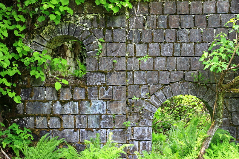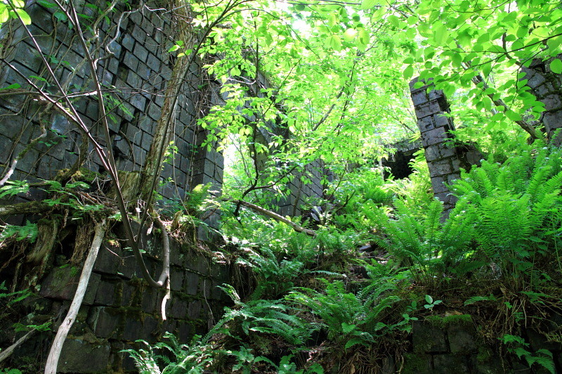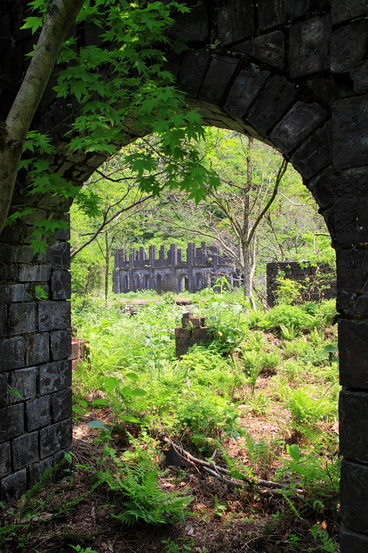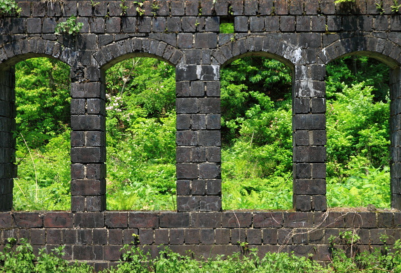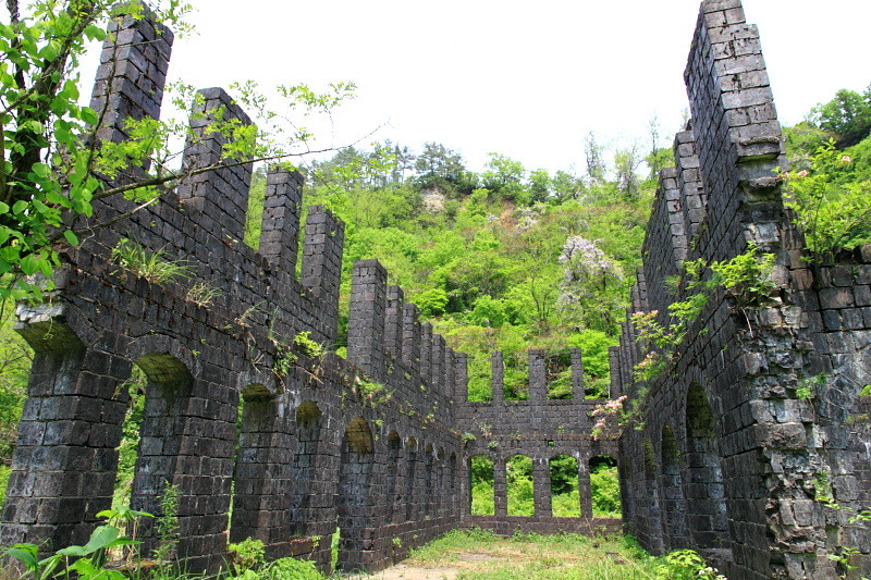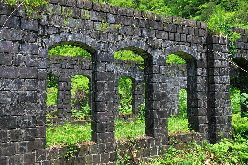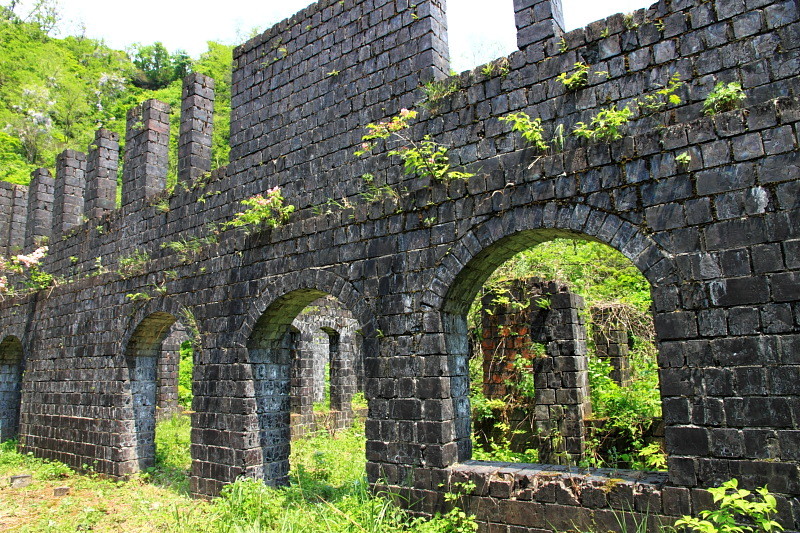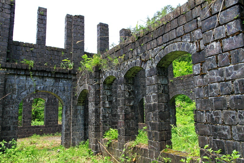 現在はカラミ煉瓦で建てられた事務所や精錬所が遺跡のように残っている。