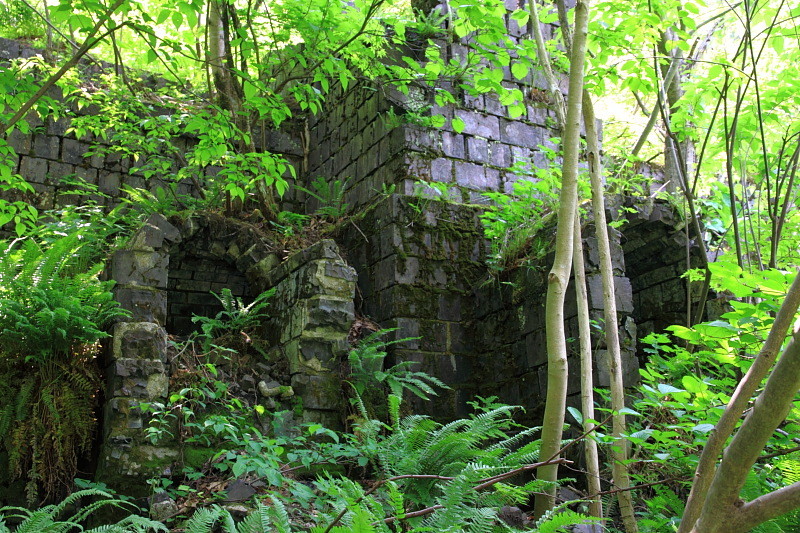 下流から川を遡ると、左手に事務所跡の煉瓦壁が見えてくる。