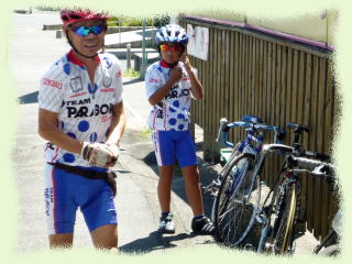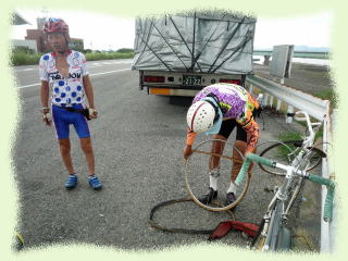 大堰を渡った所で牛嶋さんがパンクしました。チューブラータイヤなのでタイヤごと付け替えます。