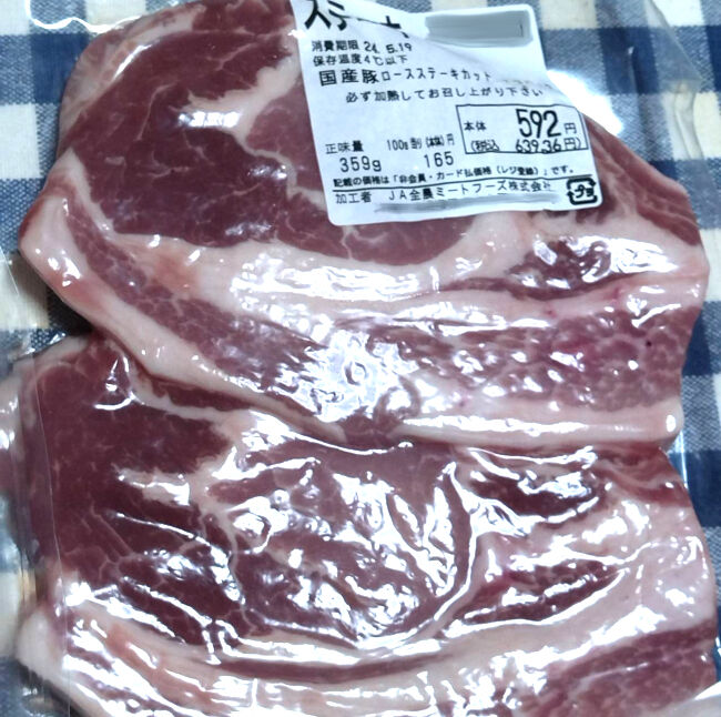 お肉はこれ。表記が「ステーキ」とあって豚肉のどの部位かわかりませんが、見た感じ多分リブロースだと思う。